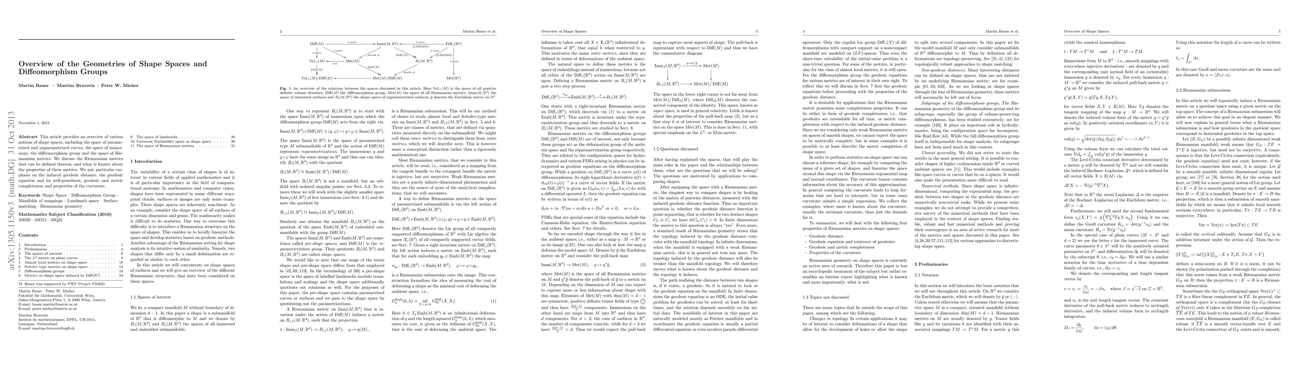 This paper provides an overview of shape spaces, including parametrized curves, immersions, diffeomorphism groups, and Riemannian metrics, focusing on induced geodesic distance, completeness, and curvature properties.