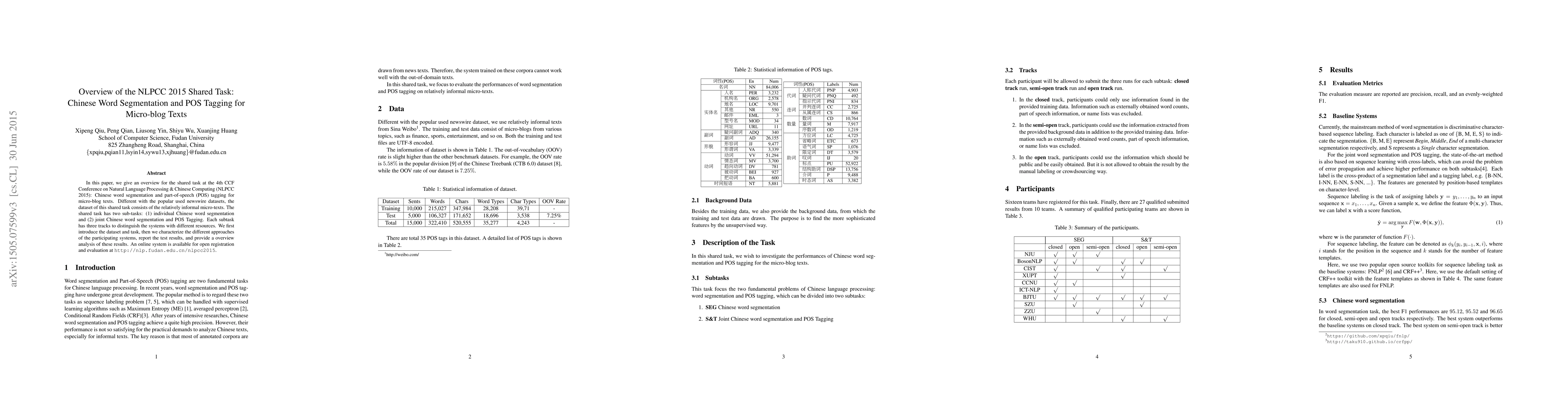 This paper provides an overview of the NLPCC 2015 shared task focused on Chinese word segmentation and POS tagging for informal micro-blog texts. It details two sub-tasks and three tracks, reports results, and analyzes the approaches of participating systems.