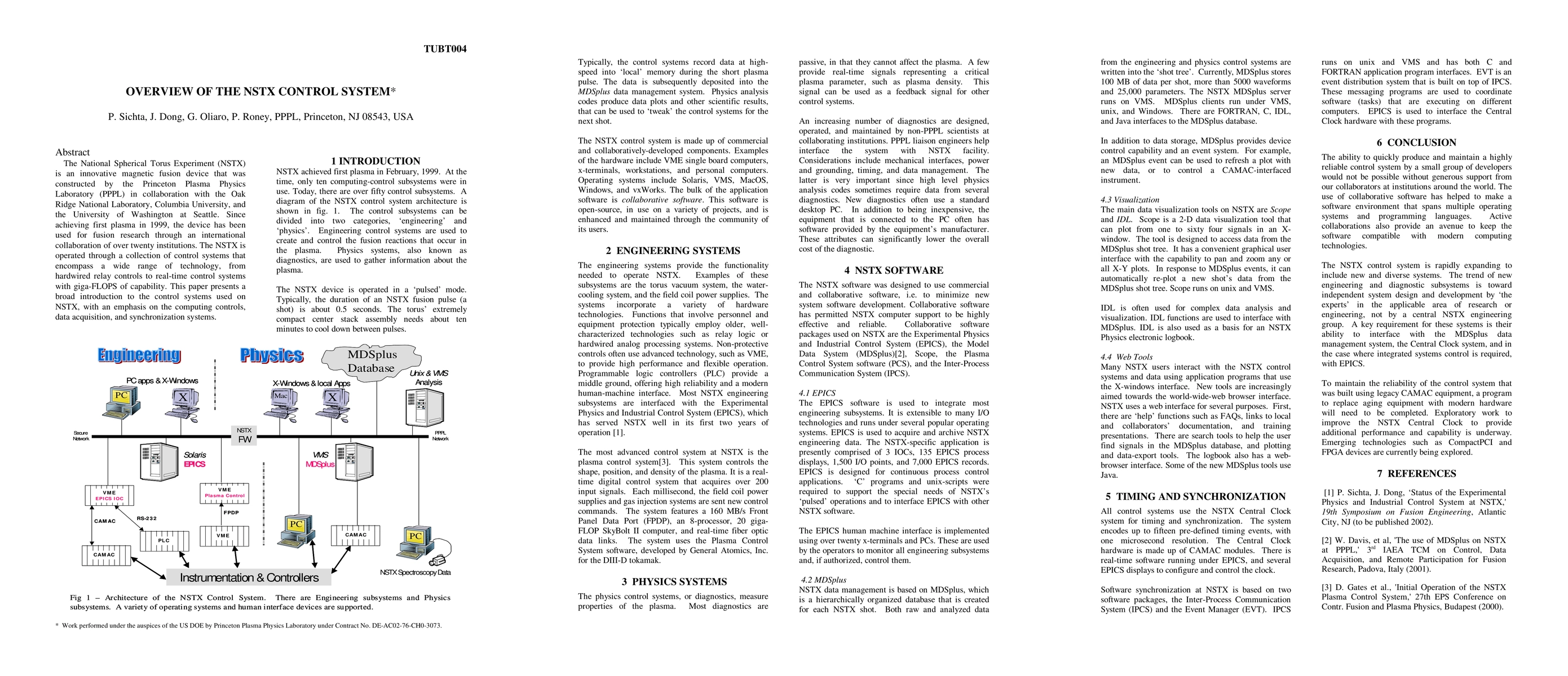 The NSTX Control System overview explains the diverse technologies used to control the National Spherical Torus Experiment, including computing controls, data acquisition, and synchronization systems. The paper provides a broad introduction to these systems, highlighting their capabilities and applications in fusion research.