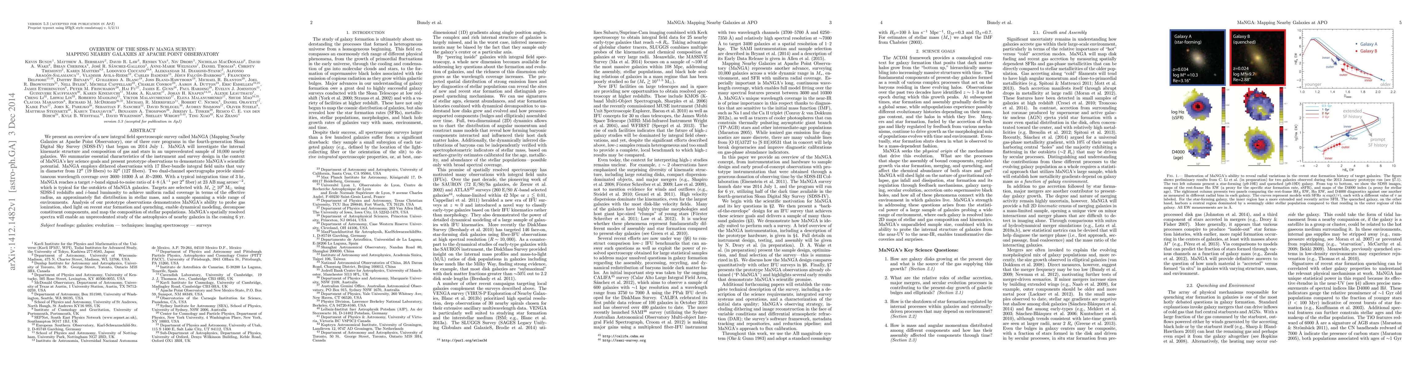 The SDSS-IV MaNGA survey aims to map the internal kinematics and composition of 10,000 nearby galaxies using integral field spectroscopy. The survey employs 17 fiber-bundle units and dual-channel spectrographs to achieve high-resolution spectra, enabling detailed studies of gas ionization, star formation, and stellar populations.