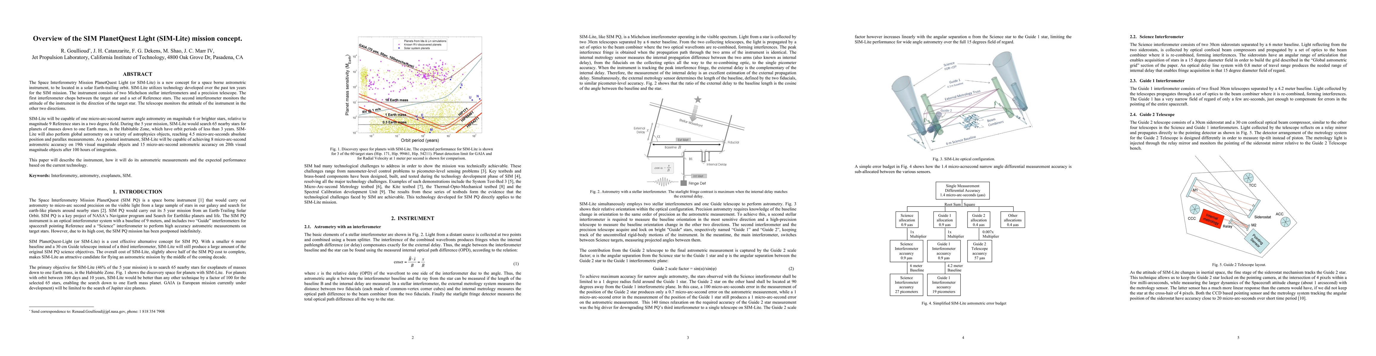 The SIM PlanetQuest Light (SIM-Lite) mission concept proposes a space-borne astrometric instrument in a solar Earth-trailing orbit, utilizing two Michelson interferometers and a precision telescope for precise measurements. It aims to achieve one micro-arc-second astrometry on bright stars and search for Earth-mass planets in habitable zones around nearby stars.