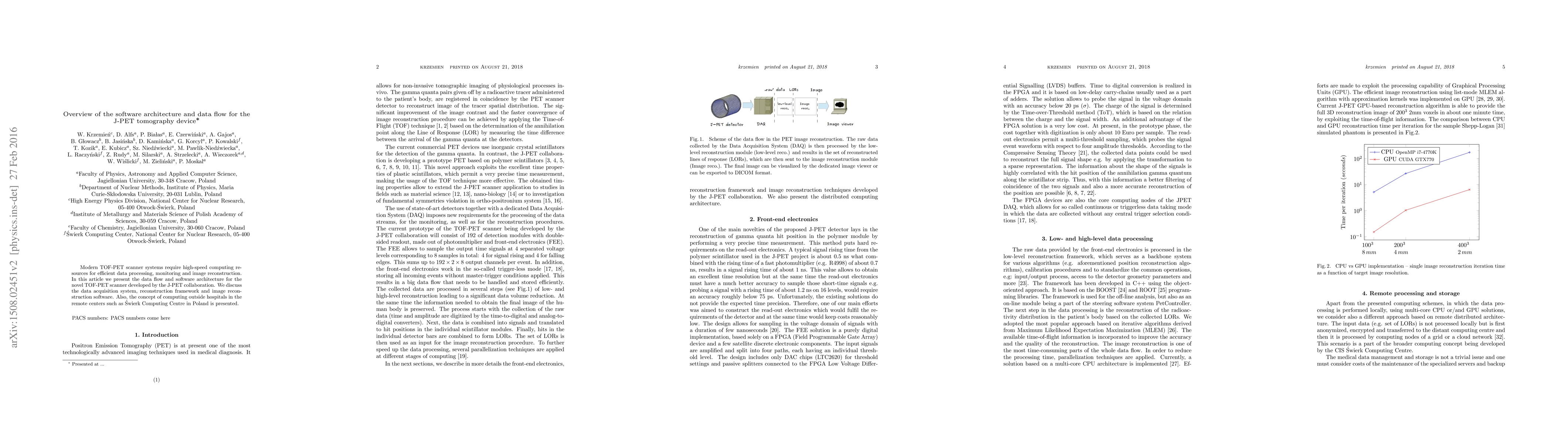 This paper outlines the software architecture and data flow for the J-PET TOF-PET scanner, detailing its data acquisition system, reconstruction framework, and image reconstruction software. It also introduces the concept of utilizing remote computing centers like the Swierk Computing Centre in Poland for efficient data processing.