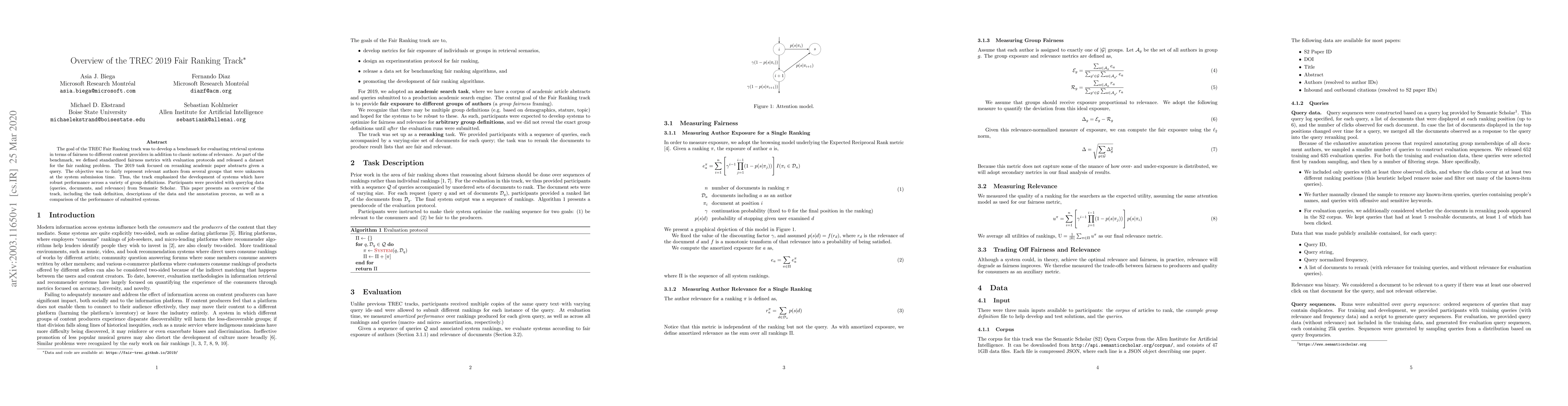 The TREC 2019 Fair Ranking Track aimed to evaluate retrieval systems for fairness towards different content providers, introducing standardized metrics and a dataset for fair ranking of academic paper abstracts. The track compared the performance of systems in fairly representing authors across various groups.