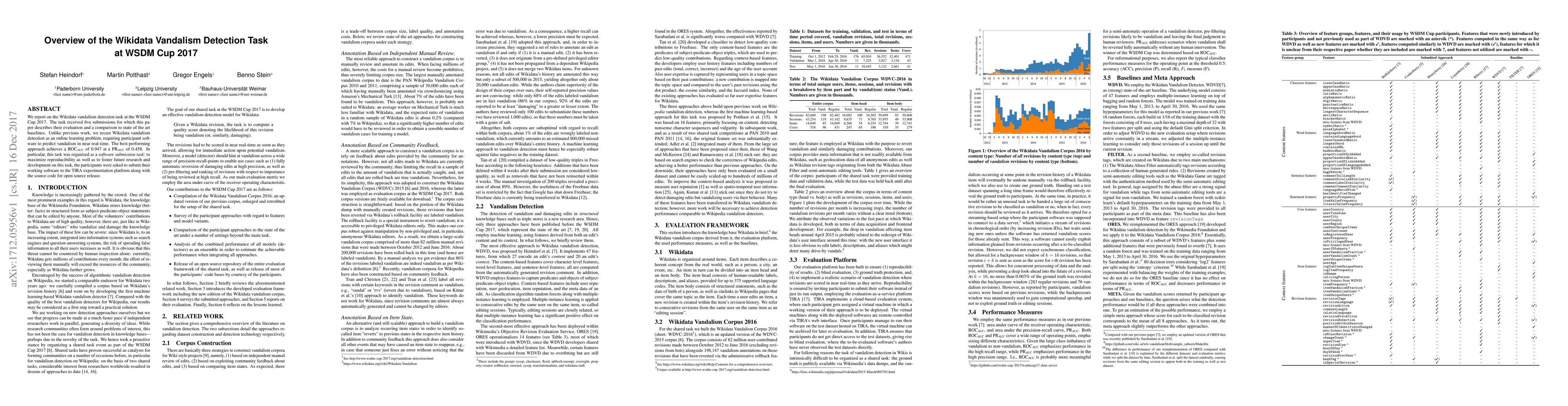 Researchers tackled Wikidata vandalism detection at WSDM Cup 2017, achieving a top-performing approach with an AUC of 0.947 in near real-time prediction. The study promotes reproducibility by requiring participants to submit their software.