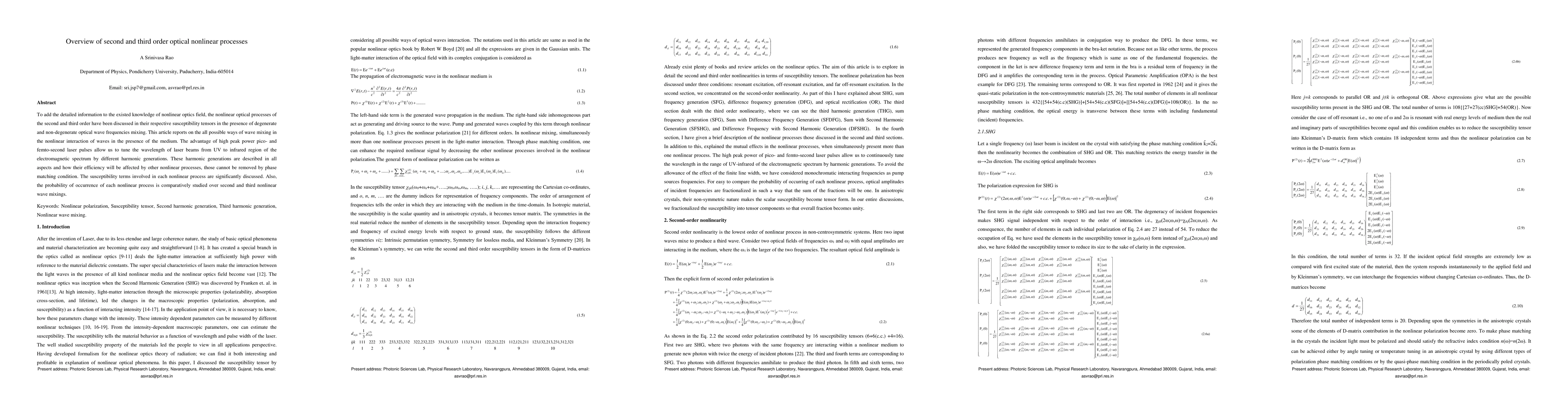 This paper provides an in-depth overview of second and third order optical nonlinear processes, discussing susceptibility tensors for both degenerate and non-degenerate optical wave mixings. It explores the efficiency and occurrence probabilities of various harmonic generations enabled by high peak power pico- and femto-second laser pulses, and examines how these processes are affected by phase matching conditions.