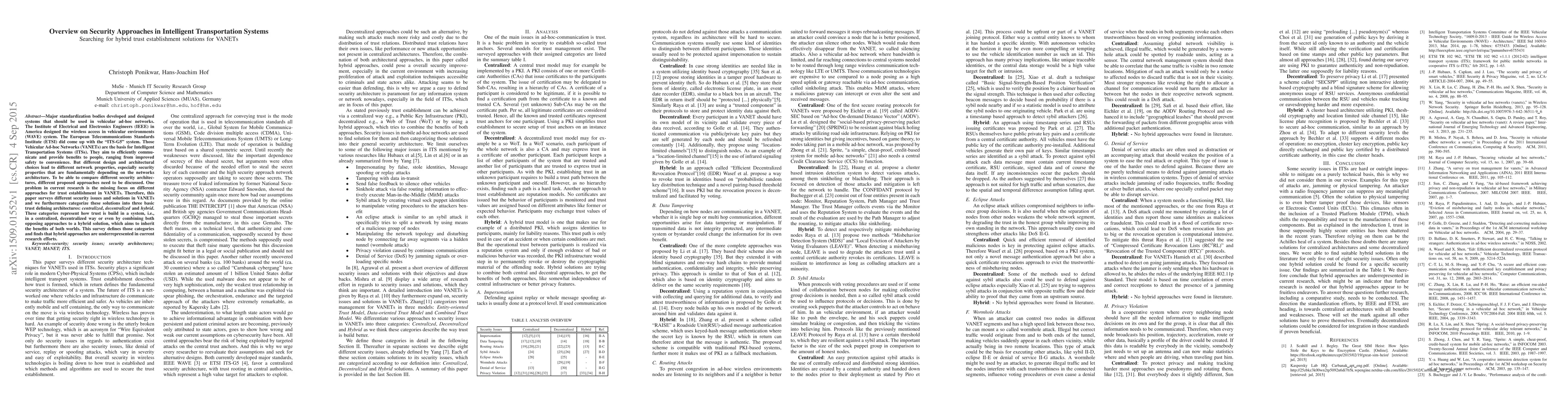 Major standardization bodies developed and designed systems that should be used in vehicular ad-hoc networks. The Institute of Electrical and Electronics Engineers (IEEE) in America designed the wireless access in vehicular environments (WAVE) system. The European Telecommunications Standards Institute (ETSI) did come up with the "ITS-G5" system. Those Vehicular Ad-hoc Networks (VANETs) are the basis for Intelligent Transportation Systems (ITSs). They aim to efficiently communicate and provide benefits to people, ranging from improved safety to convenience. But different design and architectural choices lead to different network properties, especially security properties that are fundamentally depending on the networks architecture. To be able to compare different security architectures, different proposed approaches need to be discussed. One problem in current research is the missing focus on different approaches for trust establishment in VANETs. Therefore, this paper surveys different security issues and solutions in VANETs and we furthermore categorize these solutions into three basic trust defining architectures: centralized, decentralized and hybrid. These categories represent how trust is build in a system, i.e., in a centralized, decentralized way or even by combining both opposing approaches to a hybrid solution, which aims to inherit the benefits of both worlds. This survey defines those categories and finds that hybrid approaches are underrepresented in current research efforts.