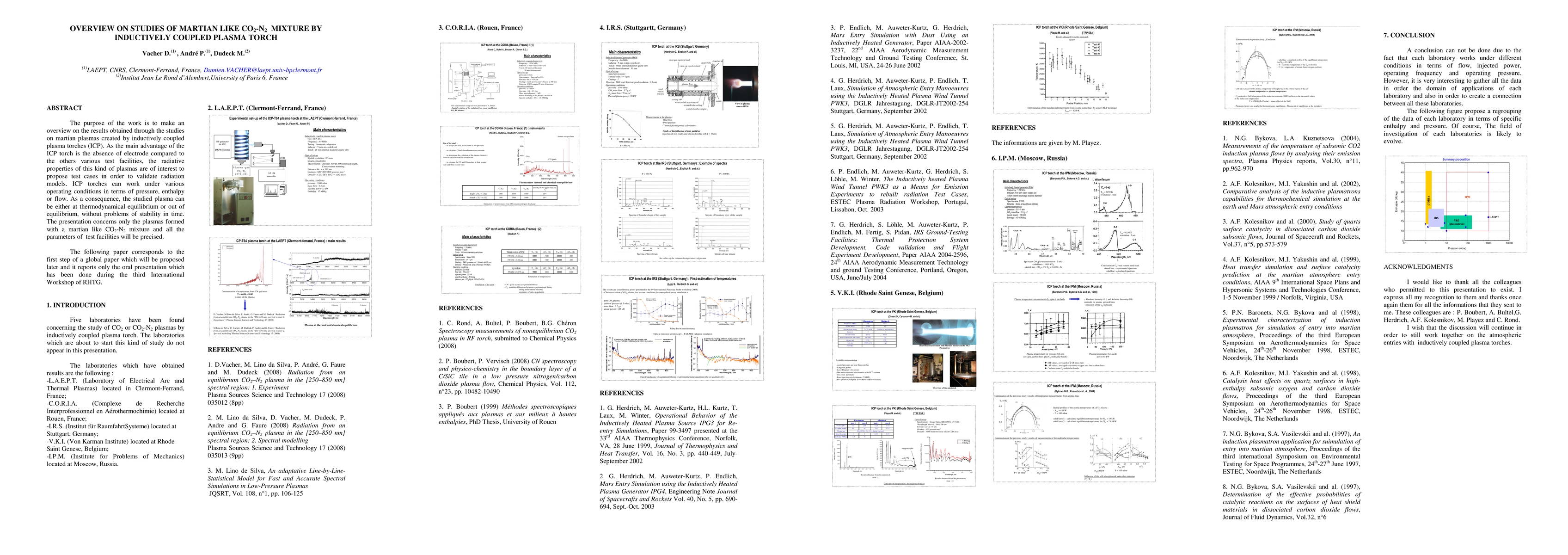 This paper provides an overview of studies on martian-like CO2-N2 plasmas generated by inductively coupled plasma torches (ICP), highlighting their radiative properties and operational flexibility. The ICP torch's electrode-less design facilitates stable, varied plasma conditions for validating radiation models.