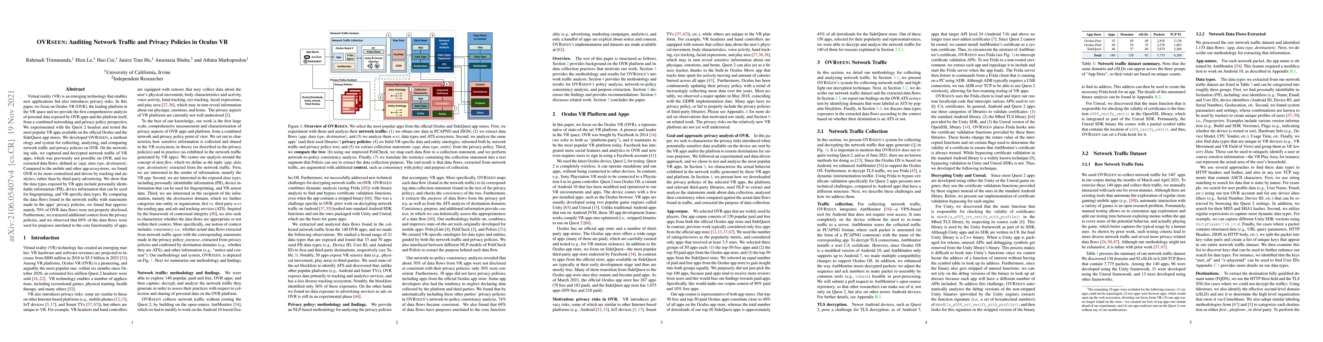 This paper examines the privacy risks associated with Oculus VR (OVR) by analyzing network traffic and privacy policies of popular VR apps. The study developed OVRseen to capture and decrypt network traffic, revealing that OVR apps expose various types of personal data, including PII and device information, often without proper disclosure in privacy policies.