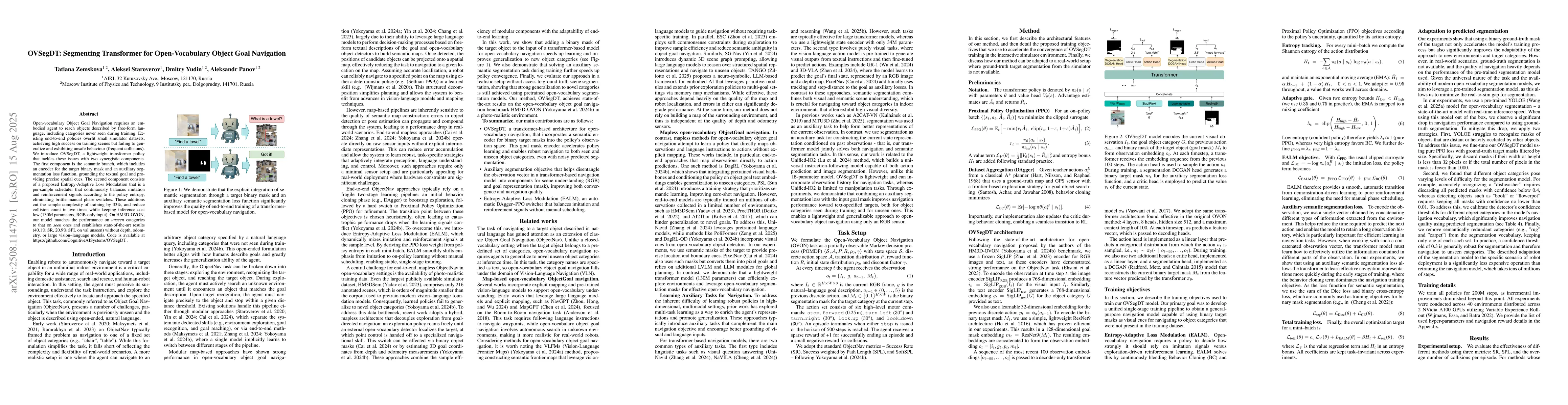 Open-vocabulary Object Goal Navigation requires an embodied agent to reach objects described by free-form language, including categories never seen during training. Existing end-to-end policies overfit small simulator datasets, achieving high success on training scenes but failing to generalize and exhibiting unsafe behaviour (frequent collisions). We introduce OVSegDT, a lightweight transformer policy that tackles these issues with two synergistic components. The first component is the semantic branch, which includes an encoder for the target binary mask and an auxiliary segmentation loss function, grounding the textual goal and providing precise spatial cues. The second component consists of a proposed Entropy-Adaptive Loss Modulation, a per-sample scheduler that continuously balances imitation and reinforcement signals according to the policy entropy, eliminating brittle manual phase switches. These additions cut the sample complexity of training by 33%, and reduce collision count in two times while keeping inference cost low (130M parameters, RGB-only input). On HM3D-OVON, our model matches the performance on unseen categories to that on seen ones and establishes state-of-the-art results (40.1% SR, 20.9% SPL on val unseen) without depth, odometry, or large vision-language models. Code is available at https://github.com/CognitiveAISystems/OVSegDT.