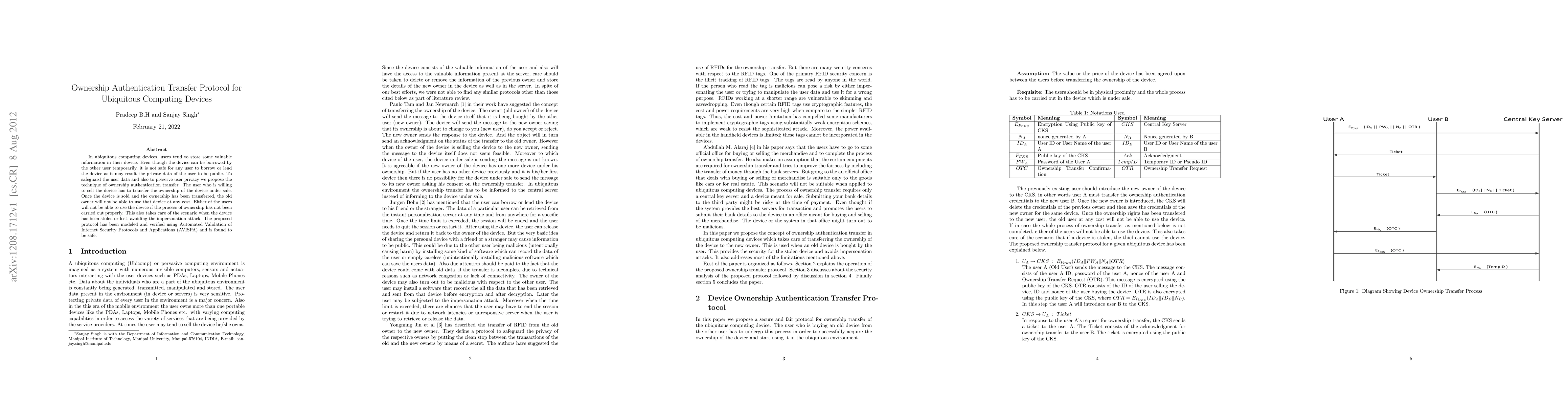 In ubiquitous computing devices, users tend to store some valuable information in their device. Even though the device can be borrowed by the other user temporarily, it is not safe for any user to borrow or lend the device as it may result the private data of the user to be public. To safeguard the user data and also to preserve user privacy we propose the technique of ownership authentication transfer. The user who is willing to sell the device has to transfer the ownership of the device under sale. Once the device is sold and the ownership has been transferred, the old owner will not be able to use that device at any cost. Either of the users will not be able to use the device if the process of ownership has not been carried out properly. This also takes care of the scenario when the device has been stolen or lost, avoiding the impersonation attack. The proposed protocol has been modeled and verified using Automated Validation of Internet Security Protocols and Applications (AVISPA) and is found to be safe.