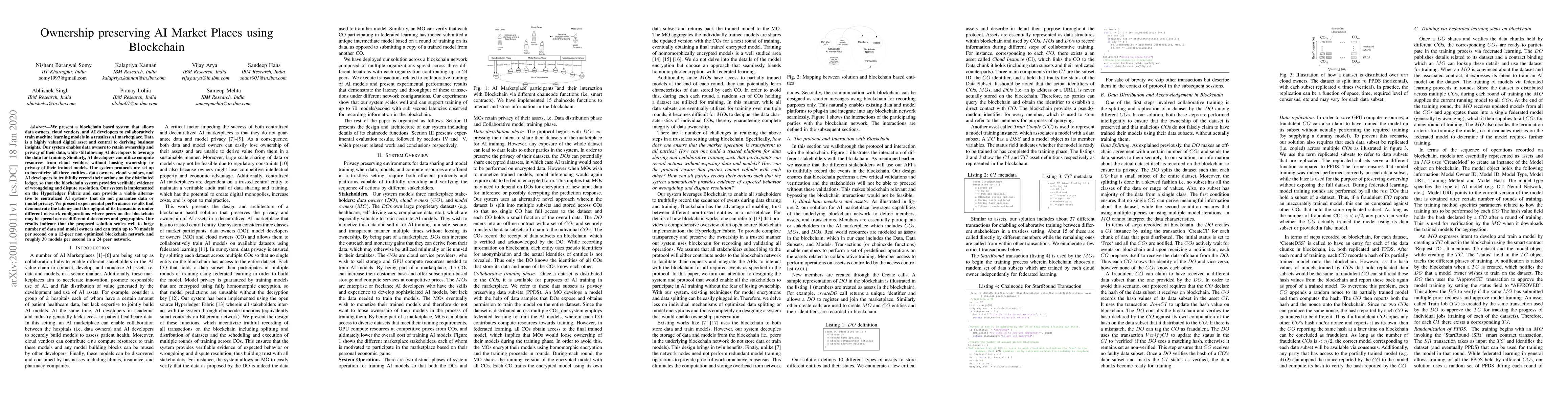 This research introduces a blockchain-based system for a trustless AI marketplace that allows data owners, cloud vendors, and AI developers to collaboratively train models while preserving data and model ownership and privacy. Experimental results show scalability, with the system capable of training up to 70 models per second on a 12-peer network.