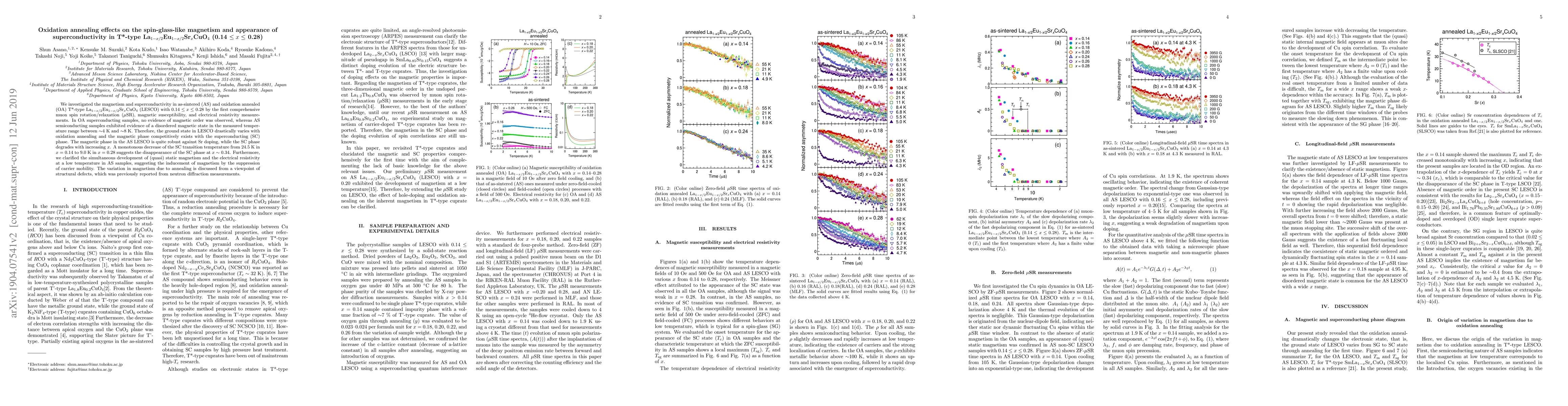 This study investigates the effects of oxidation annealing on the magnetism and superconductivity in T*-type La$_{1-x/2}$Eu$_{1-x/2}$Sr$_x$CuO$_4$ (LESCO) with 0.14 $\leq x \leq$ 0.28. Oxidation annealing eliminates magnetic order while inducing superconductivity, indicating a competitive relationship between magnetic and superconducting phases.