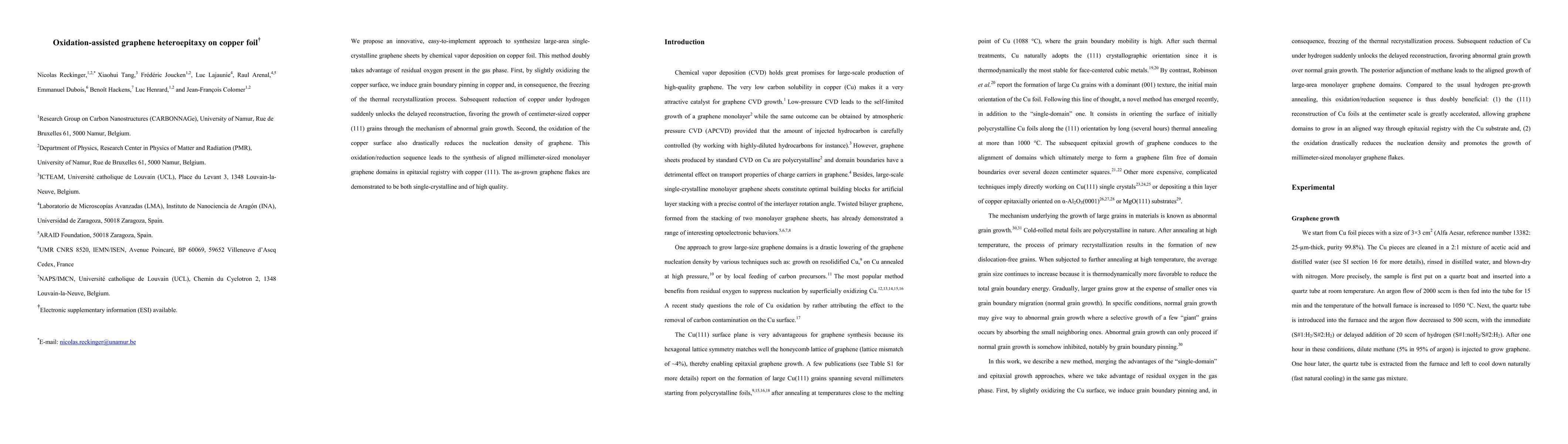 This paper presents an innovative method for synthesizing large-area, single-crystalline graphene on copper foil by leveraging oxidation and reduction processes. The approach induces grain boundary pinning and reduces graphene nucleation density, resulting in high-quality, aligned monolayer graphene domains.