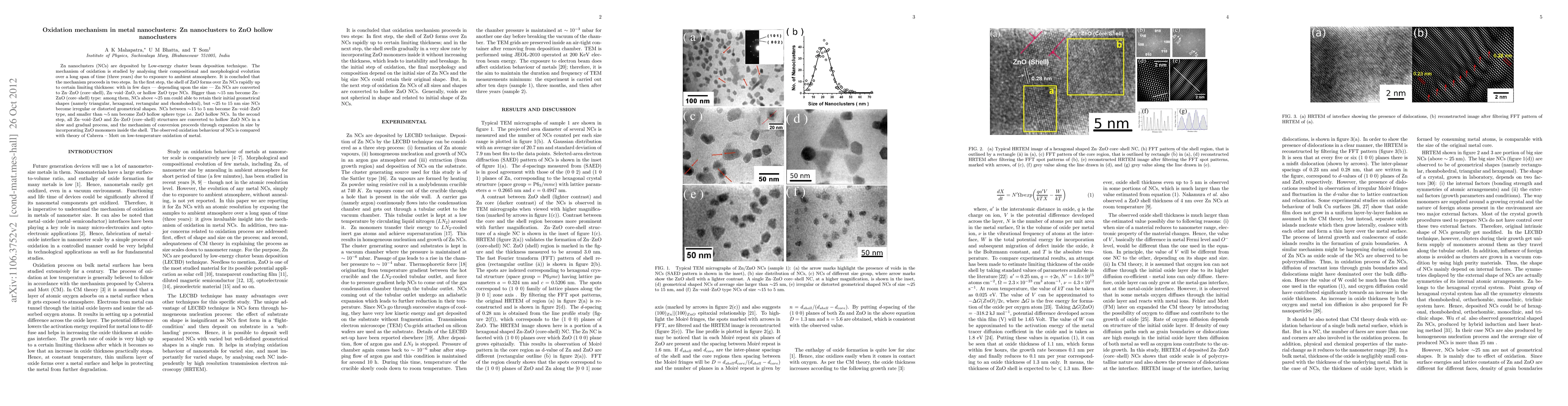 Zn nanoclusters (NCs) are deposited by Low-energy cluster beam deposition technique. The mechanism of oxidation is studied by analysing their compositional and morphological evolution over a long span of time (three years) due to exposure to ambient atmosphere. It is concluded that the mechanism proceeds in two steps. In the first step, the shell of ZnO forms over Zn NCs rapidly up to certain limiting thickness: with in few days -- depending upon the size -- Zn NCs are converted to Zn-ZnO (core-shell), Zn-void-ZnO, or hollow ZnO type NCs. Bigger than ~15 nm become Zn-ZnO (core-shell) type: among them, NCs above ~25 nm could able to retain their initial geometrical shapes (namely triangular, hexagonal, rectangular and rhombohedral), but ~25 to 15 nm size NCs become irregular or distorted geometrical shapes. NCs between ~15 to 5 nm become Zn-void-ZnO type, and smaller than ~5 nm become ZnO hollow sphere type i.e. ZnO hollow NCs. In the second step, all Zn-void-ZnO and Zn-ZnO (core-shell) structures are converted to hollow ZnO NCs in a slow and gradual process, and the mechanism of conversion proceeds through expansion in size by incorporating ZnO monomers inside the shell. The observed oxidation behaviour of NCs is compared with theory of Cabrera - Mott on low-temperature oxidation of metal.