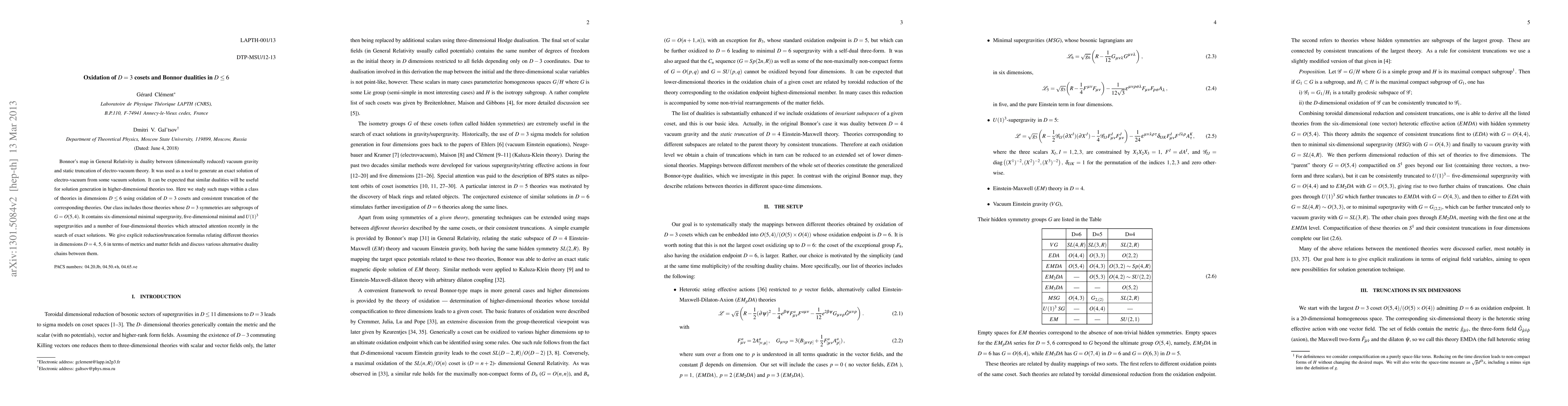 Bonnor's map in General Relativity is duality between (dimensionally reduced) vacuum gravity and static truncation of electro-vacuum theory. It was used as a tool to generate an exact solution of electro-vacuum from some vacuum solution. It can be expected that similar dualities will be useful for solution generation in higher-dimensional theories too. Here we study such maps within a class of theories in dimensions $D\leq 6$ using oxidation of D=3 cosets and consistent truncation of the corresponding theories. Our class includes those theories whose D=3 symmetries are subgroups of $G=O(5,4)$. It contains six-dimensional minimal supergravity, five-dimensional minimal and $U(1)^3$ supergravities and a number of four-dimensional theories which attracted attention recently in the search of exact solutions. We give explicit reduction/truncation formulas relating different theories in dimensions $D=4, 5, 6$ in terms of metrics and matter fields and discuss various alternative duality chains between them.