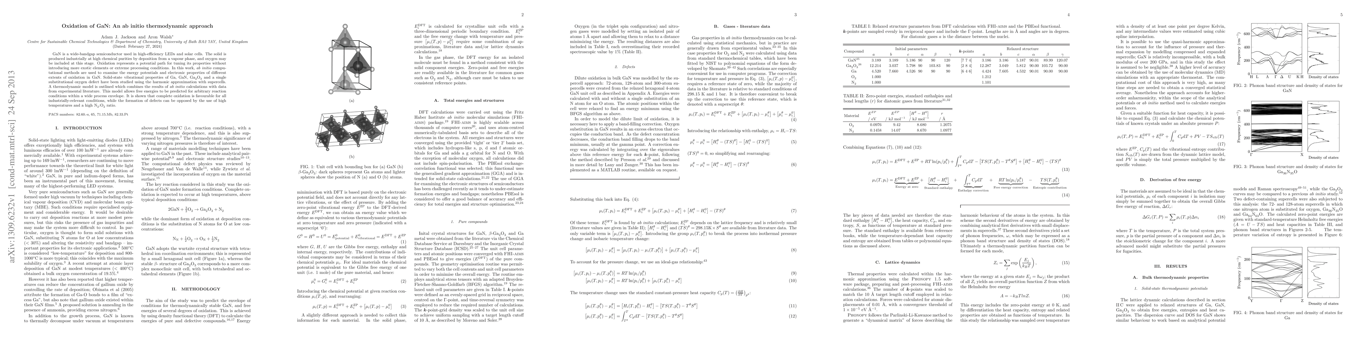 GaN is a wide-bandgap semiconductor used in high-efficiency LEDs and solar cells. The solid is produced industrially at high chemical purities by deposition from a vapour phase, and oxygen may be included at this stage. Oxidation represents a potential path for tuning its properties without introducing more exotic elements or extreme processing conditions. In this work, ab initio computational methods are used to examine the energy potentials and electronic properties of different extents of oxidation in GaN. Solid-state vibrational properties of Ga, GaN, Ga2O3 and a single substitutional oxygen defect have been studied using the harmonic approximation with supercells. A thermodynamic model is outlined which combines the results of ab initio calculations with data from experimental literature. This model allows free energies to be predicted for arbitrary reaction conditions within a wide process envelope. It is shown that complete oxidation is favourable for all industrially-relevant conditions, while the formation of defects can be opposed by the use of high temperatures and a high N2:O2 ratio.