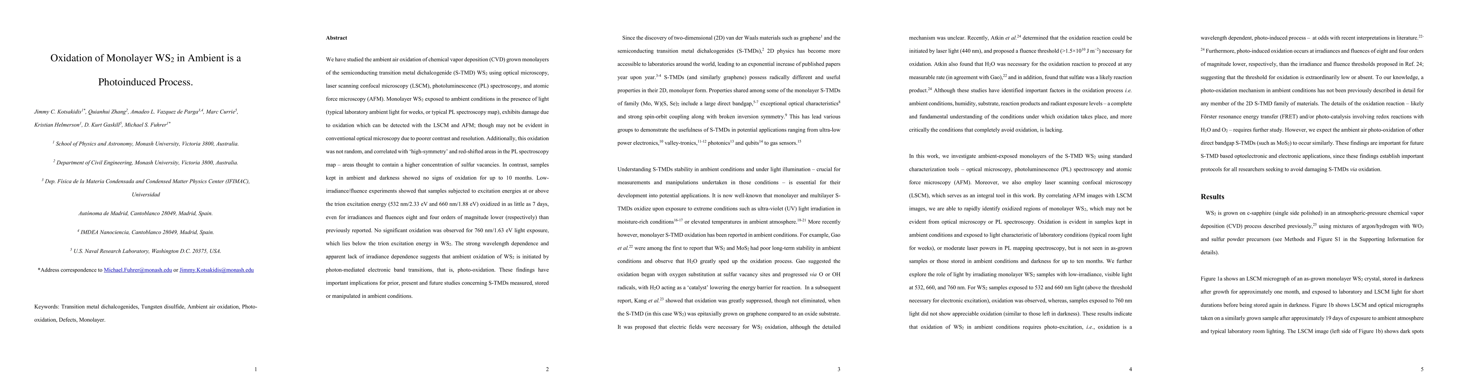 We have studied the ambient air oxidation of chemical vapor deposition (CVD) grown monolayers of the semiconducting transition metal dichalcogenide (S-TMD) WS$_{2}$ using optical microscopy, laser scanning confocal microscopy (LSCM), photoluminescence (PL) spectroscopy, and atomic force microscopy (AFM). Monolayer WS$_{2}$ exposed to ambient conditions in the presence of light (typical laboratory ambient light for weeks, or typical PL spectroscopy map), exhibits damage due to oxidation which can be detected with the LSCM and AFM; though may not be evident in conventional optical microscopy due to poorer contrast and resolution. Additionally, this oxidation was not random, and correlated with 'high-symmetry' and red-shifted areas in the PL spectroscopy map - areas thought to contain a higher concentration of sulfur vacancies. In contrast, samples kept in ambient and darkness showed no signs of oxidation for up to 10 months. Low-irradiance/fluence experiments showed that samples subjected to excitation energies at or above the trion excitation energy (532 nm/2.33 eV and 660 nm/1.88 eV) oxidized in as little as 7 days, even for irradiances and fluences eight and four orders of magnitude lower (respectively) than previously reported. No significant oxidation was observed for 760 nm/1.63 eV light exposure, which lies below the trion excitation energy in WS$_{2}$. The strong wavelength dependence and apparent lack of irradiance dependence suggests that ambient oxidation of WS$_{2}$ is initiated by photon-mediated electronic band transitions, that is, photo-oxidation. These findings have important implications for prior, present and future studies concerning S-TMDs measured, stored or manipulated in ambient conditions.