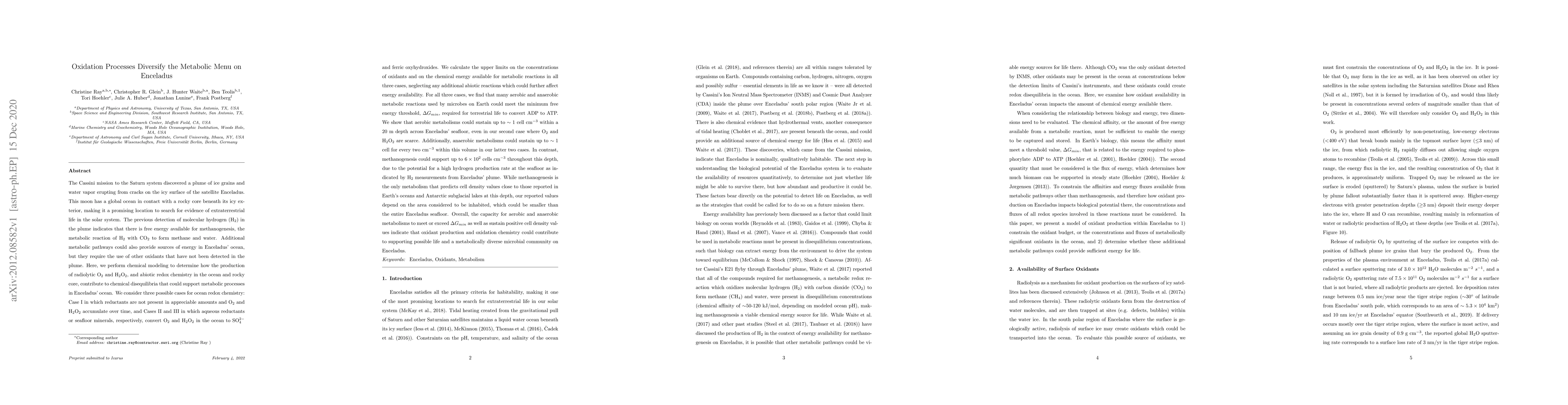 The Cassini mission revealed Enceladus' plume, indicating a global ocean with potential for life. Chemical modeling suggests that oxidation processes, including radiolytic O$_2$ and H$_2$O$_2$ production, could support diverse metabolic pathways and sustain microbial life in Enceladus' ocean.