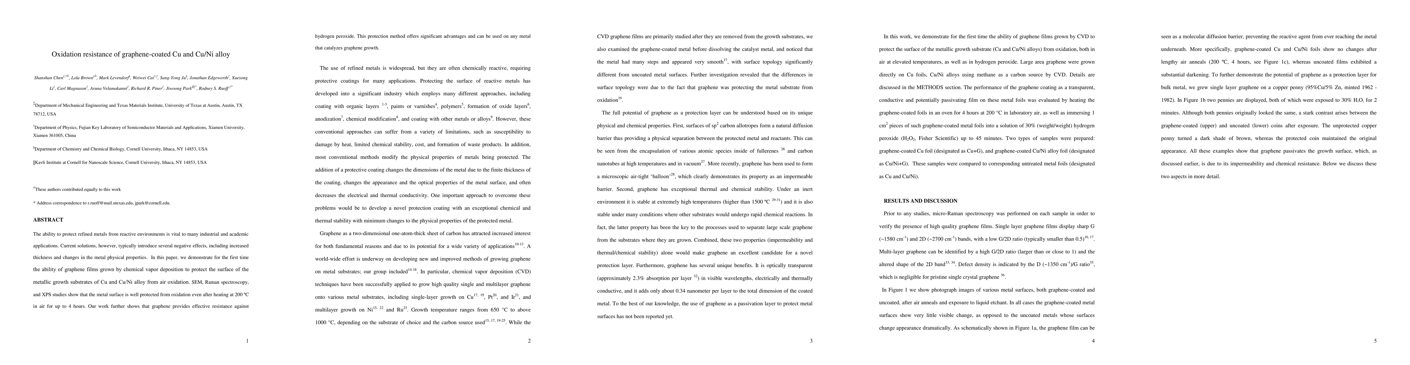 This study demonstrates that graphene films grown via chemical vapor deposition effectively protect copper (Cu) and Cu/Ni alloy surfaces from air oxidation and hydrogen peroxide exposure, as shown by SEM, Raman spectroscopy, and XPS analyses, even after prolonged heating. This method provides a thin, efficient protective layer without altering the metals' physical properties.