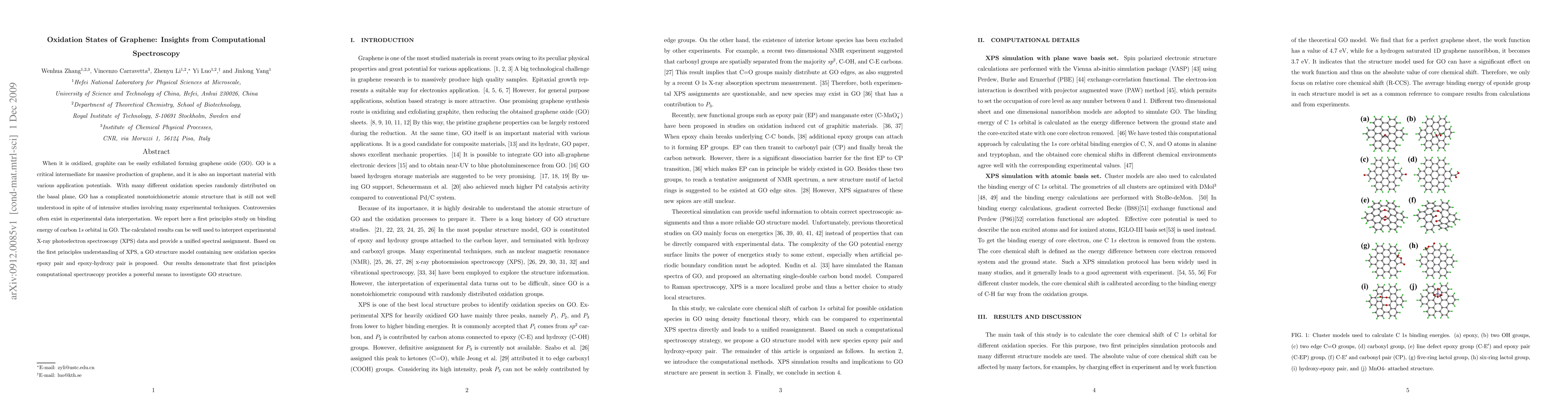 When it is oxidized, graphite can be easily exfoliated forming graphene oxide (GO). GO is a critical intermediate for massive production of graphene, and it is also an important material with various application potentials. With many different oxidation species randomly distributed on the basal plane, GO has a complicated nonstoichiometric atomic structure that is still not well understood in spite of of intensive studies involving many experimental techniques. Controversies often exist in experimental data interpretation. We report here a first principles study on binding energy of carbon 1s orbital in GO. The calculated results can be well used to interpret experimental X-ray photoelectron spectroscopy (XPS) data and provide a unified spectral assignment. Based on the first principles understanding of XPS, a GO structure model containing new oxidation species epoxy pair and epoxy-hydroxy pair is proposed. Our results demonstrate that first principles computational spectroscopy provides a powerful means to investigate GO structure.