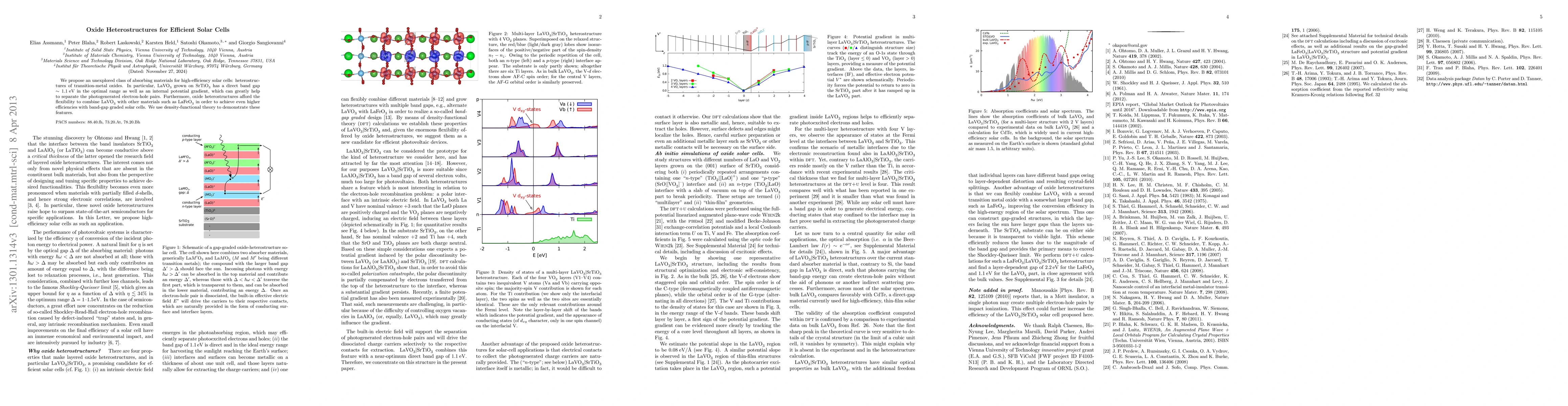 This paper proposes transition-metal oxide heterostructures, specifically LaVO_3 on SrTiO_3, as a new class of materials for efficient solar cells due to their optimal band gap and internal potential gradient for electron-hole separation. Density-functional theory supports the potential for combining these materials to achieve higher efficiency.