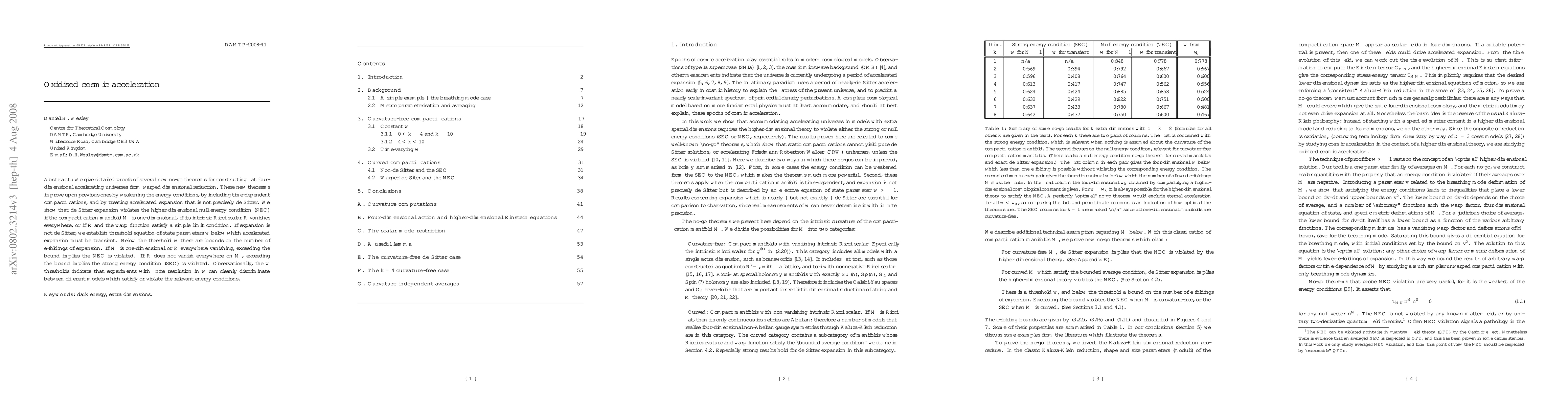 We give detailed proofs of several new no-go theorems for constructing flat four-dimensional accelerating universes from warped dimensional reduction. These new theorems improve upon previous ones by weakening the energy conditions, by including time-dependent compactifications, and by treating accelerated expansion that is not precisely de Sitter. We show that de Sitter expansion violates the higher-dimensional null energy condition (NEC) if the compactification manifold M is one-dimensional, if its intrinsic Ricci scalar R vanishes everywhere, or if R and the warp function satisfy a simple limit condition. If expansion is not de Sitter, we establish threshold equation-of-state parameters w below which accelerated expansion must be transient. Below the threshold w there are bounds on the number of e-foldings of expansion. If M is one-dimensional or R everywhere vanishing, exceeding the bound implies the NEC is violated. If R does not vanish everywhere on M, exceeding the bound implies the strong energy condition (SEC) is violated. Observationally, the w thresholds indicate that experiments with finite resolution in w can cleanly discriminate between different models which satisfy or violate the relevant energy conditions.