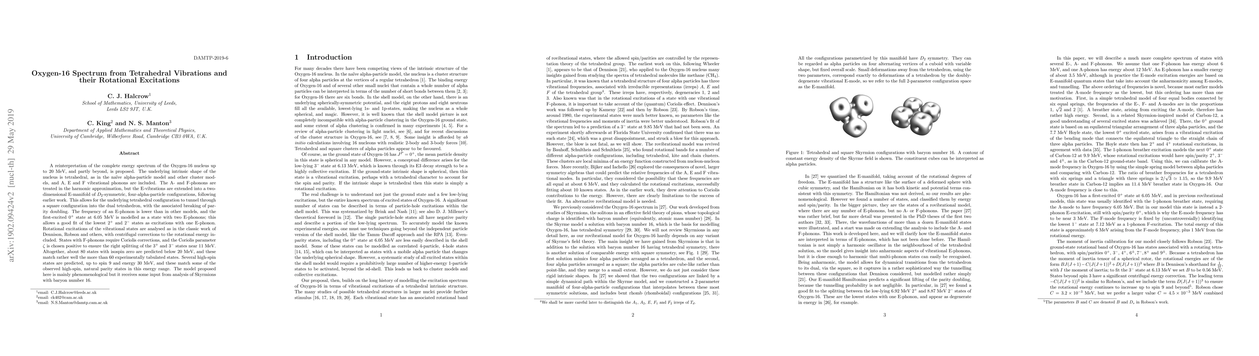 A reinterpretation of the complete energy spectrum of the Oxygen-16 nucleus up to 20 MeV, and partly beyond, is proposed. The underlying intrinsic shape of the nucleus is tetrahedral, as in the na\"ive alpha-particle model and other cluster models, and A, E and F vibrational phonons are included. The A- and F-phonons are treated in the harmonic approximation, but the E-vibrations are extended into a two-dimensional E-manifold of D2-symmetric, four-alpha-particle configurations, following earlier work. This allows for the underlying tetrahedral configuration to deform through a square configuration into the dual tetrahedron, so there is tunnelling between the tetrahedron and its dual, with the associated breaking of parity doubling. However, E-manifold states can still be interpreted in terms of E-phonons. Rotational excitations of the vibrational states are analysed as in the classic work of Dennison, Robson and others, with centrifugal corrections to the rotational energy spectrum included. States with F-phonons require Coriolis corrections too. The first-excited $0^+$ state at 6.05 MeV is modelled as a state with two E-phonons; this allows a good fit of the lowest $2^+$ and $2^-$ states as excitations with one E-phonon. The Coriolis parameter $\zeta$ is chosen positive to ensure the right splitting of the $3^+$ and $3^-$ states near 11 MeV. Altogether, about 80 states with isospin zero are predicted below 20 MeV, and these match rather well the more than 60 experimentally tabulated states. Several high-spin states are predicted, up to spin 9 and energy 30 MeV, and these match some of the high-spin, natural parity states in this energy range that have been observed. The model proposed here is mainly phenomenological but it receives some input from analysis of Skyrmions with baryon number 16.