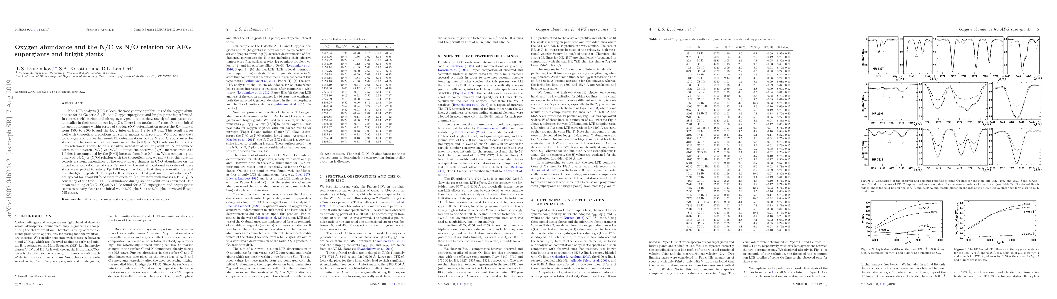 This study investigates oxygen abundances in AFG supergiants and bright giants using non-LTE analysis, finding no significant anomalies. A strong correlation between [N/C] vs [N/O] is observed, indicating a dependency on initial rotational velocities and confirming the constancy of total C+N+O abundance during stellar evolution.