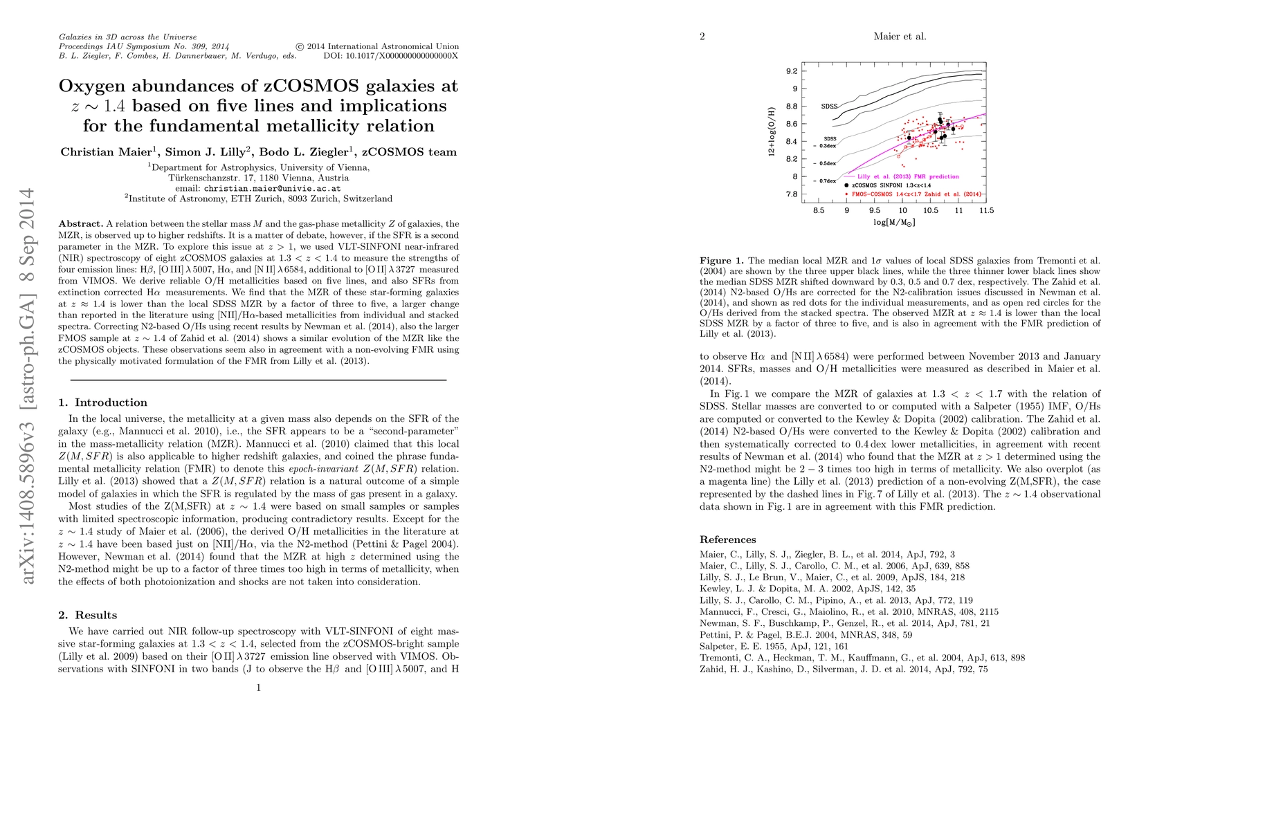 This study measures the oxygen abundances in eight zCOSMOS galaxies at z~1.4 using five emission lines, revealing that the fundamental metallicity relation (MZR) is lower than the local MZR by a factor of three to five. These findings suggest a significant evolution in the MZR at high redshifts, supporting a non-evolving fundamental metallicity relation (FMR).