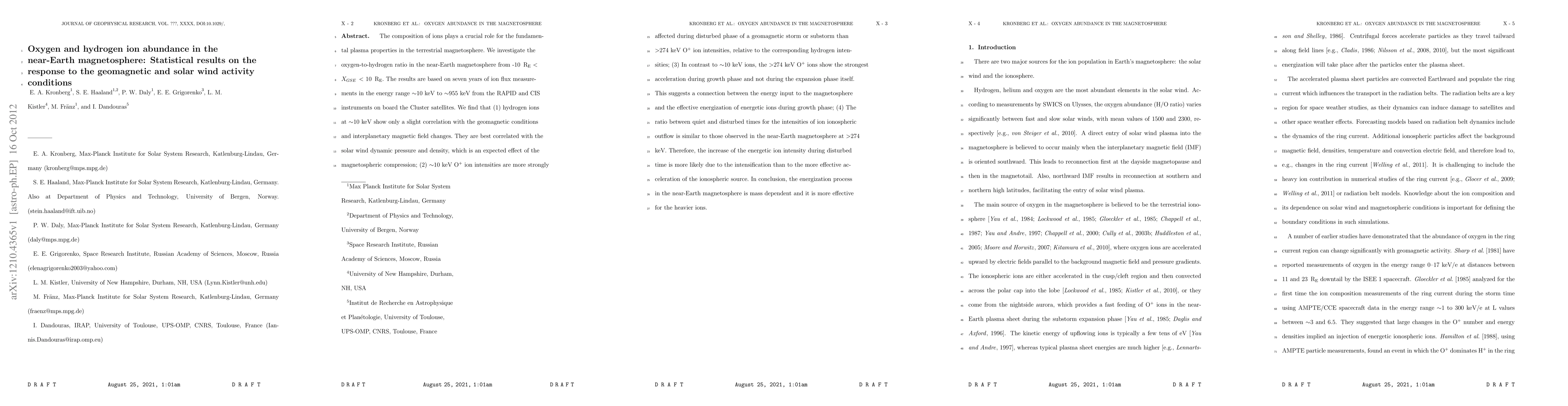 This study analyzes seven years of ion flux data from Cluster satellites to determine the oxygen-to-hydrogen ratio in the near-Earth magnetosphere. It finds that lower-energy hydrogen ions correlate more with solar wind conditions, while higher-energy oxygen ions are more affected during geomagnetic disturbances, suggesting mass-dependent energization processes.