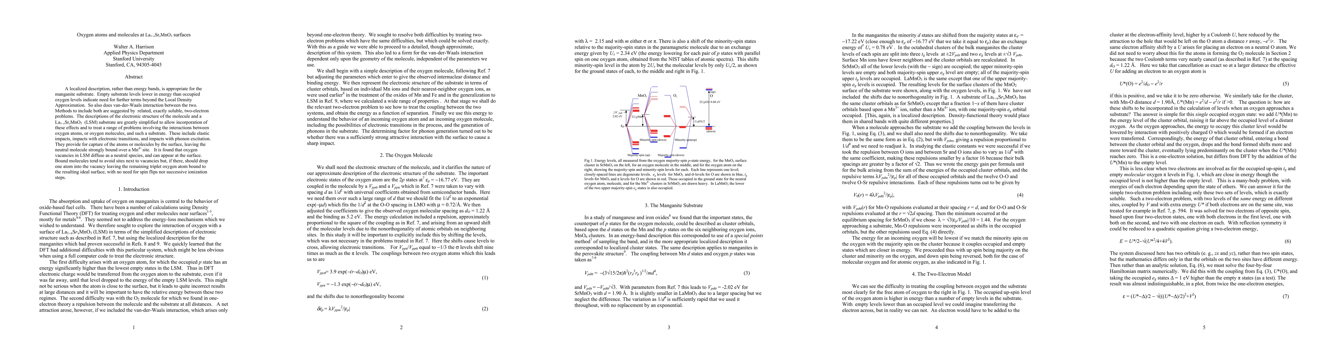 A localized description, rather than energy bands, is appropriate for the manganite substrate. Empty substrate levels lower in energy than occupied oxygen levels indicate need for further terms beyond the Local Density Approximation. So also does van-der-Waals interaction between the two. Methods to include both are suggested by related, exactly soluble, two-electron problems. The descriptions of the electronic structure of the molecule and a LaSrMnO3 (LSM) substrate are greatly simplified to allow incorporation of these effects and to treat a range of problems involving the interactions between oxygen atoms, or oxygen molecules, and such a substrate. These include elastic impacts, impacts with electronic transitions, and impacts with phonon excitation. They provide for capture of the atoms or molecules by the surface, leaving the neutral molecule strongly bound over a Mn(4+) site. It is found that oxygen vacancies in LSM diffuse as a neutral species, and can appear at the surface. Bound molecules tend to avoid sites next to vacancies but, if there, should drop one atom into the vacancy leaving the remaining triplet oxygen atom bound to the resulting ideal surface, with no need for spin flips nor successive ionization steps.