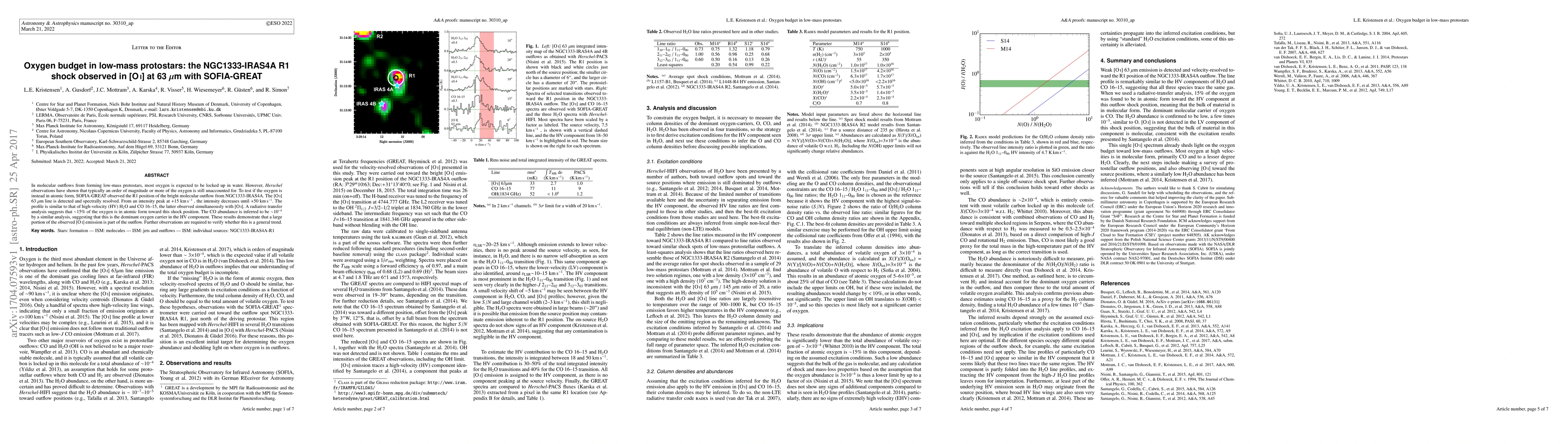 This paper investigates the oxygen budget in the NGC1333-IRAS4A R1 shock using SOFIA-GREAT observations of the [OI] 63 um line, finding that ~15% of oxygen is in atomic form. The study suggests that CO is the dominant oxygen carrier in the high-velocity outflow component, indicating a significant portion of [OI] emission is part of the outflow. Further observations are needed to confirm this trend.