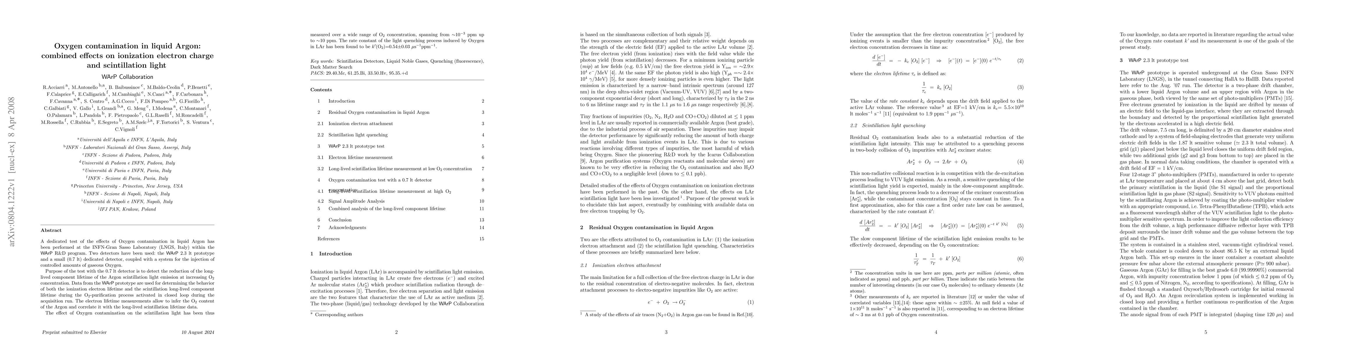 A study at LNGS, Italy, tested Oxygen contamination in liquid Argon, finding that it reduces scintillation light's long-lived component lifetime. Using two detectors, researchers measured electron lifetime and scintillation lifetime across a wide O2 concentration range (10^-3 to 10 ppm), determining the light quenching rate constant (k'(O2)=0.54±0.03 μs^-1 ppm^-1).
