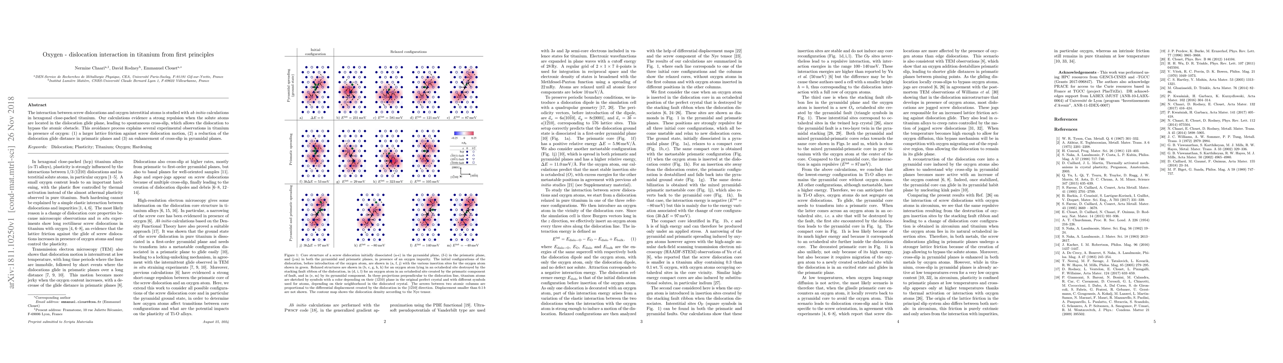 This study uses ab initio calculations to investigate the interaction between screw dislocations and oxygen interstitials in titanium, revealing a strong repulsion that induces cross-slip, explaining increased lattice friction, reduced glide distance, and enhanced cross-slip in the presence of oxygen.