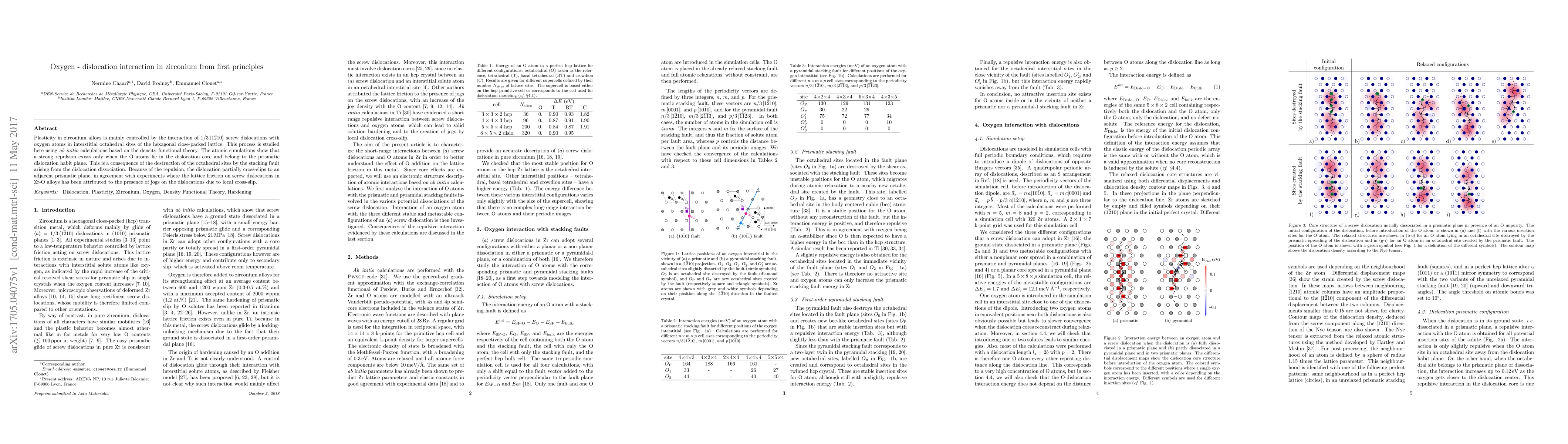 This study uses ab initio calculations to investigate the interaction between oxygen atoms and 1/3 <1210> screw dislocations in zirconium, revealing that strong repulsion occurs when oxygen atoms are within the dislocation core on the prismatic plane, leading to dislocation cross-slip and jog formation, which explains the observed lattice friction in zirconium-oxygen alloys.