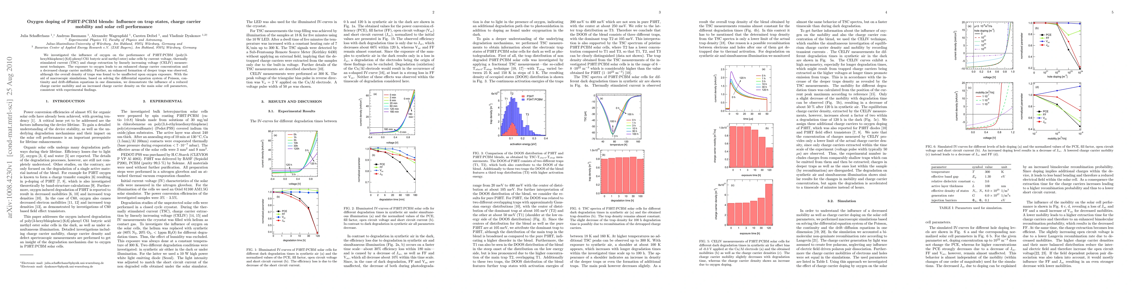 Summary: Oxygen doping of P3HT:PCBM blends enhances charge carrier concentration but decreases mobility, leading to deeper trap formation. Macroscopic simulations corroborate the impact on solar cell performance, aligning with experimental observations.