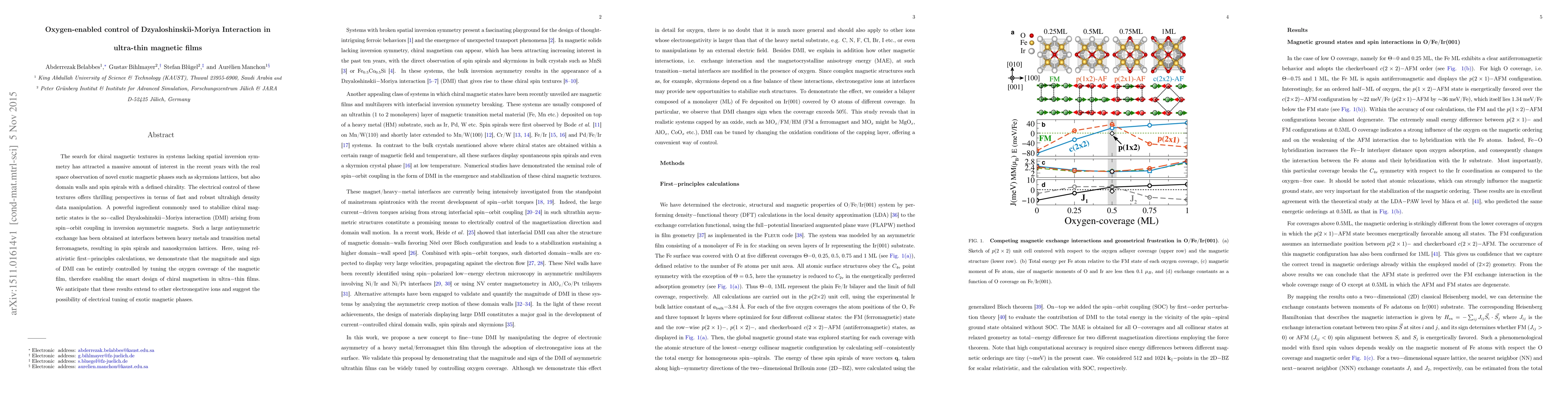 This study demonstrates that oxygen coverage can control the Dzyaloshinskii-Moriya Interaction (DMI) in ultra-thin magnetic films, enabling the manipulation of chiral magnetic textures through electrical means. The findings suggest a pathway for designing and tuning exotic magnetic phases using electronegative ions.