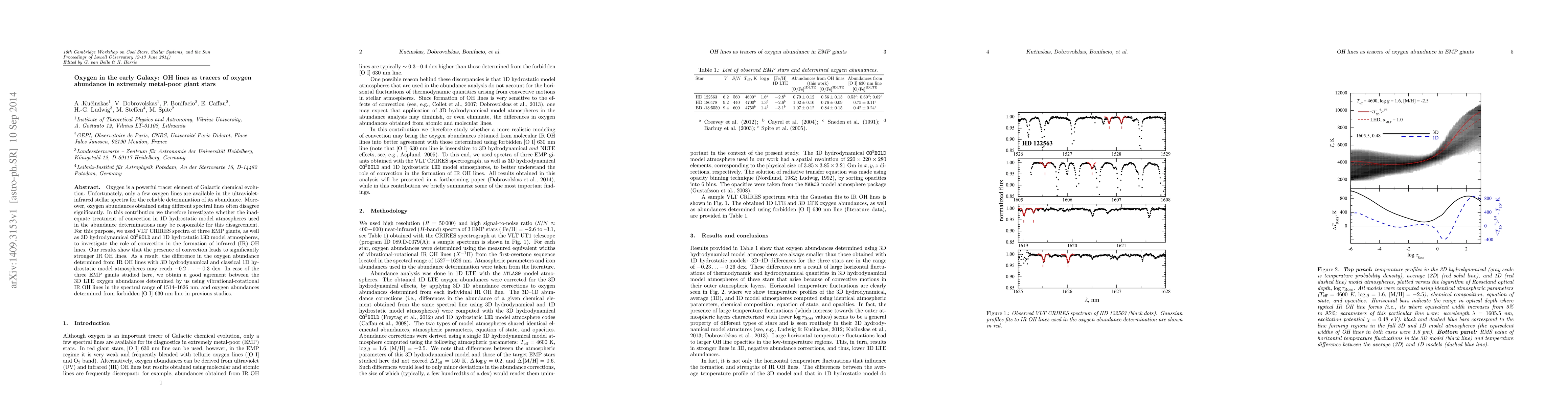 Oxygen is a powerful tracer element of Galactic chemical evolution. Unfortunately, only a few oxygen lines are available in the ultraviolet-infrared stellar spectra for the reliable determination of its abundance. Moreover, oxygen abundances obtained using different spectral lines often disagree significantly. In this contribution we therefore investigate whether the inadequate treatment of convection in 1D hydrostatic model atmospheres used in the abundance determinations may be responsible for this disagreement. For this purpose, we used VLT CRIRES spectra of three EMP giants, as well as 3D hydrodynamical CO$^5$BOLD and 1D hydrostatic LHD model atmospheres, to investigate the role of convection in the formation of infrared (IR) OH lines. Our results show that the presence of convection leads to significantly stronger IR OH lines. As a result, the difference in the oxygen abundance determined from IR OH lines with 3D hydrodynamical and classical 1D hydrostatic model atmospheres may reach -0.2 ... -0.3 dex. In case of the three EMP giants studied here, we obtain a good agrement between the 3D LTE oxygen abundances determined by us using vibrational-rotational IR OH lines in the spectral range of 1514-1626 nm, and oxygen abundances determined from forbidden [O I] 630 nm line in previous studies.