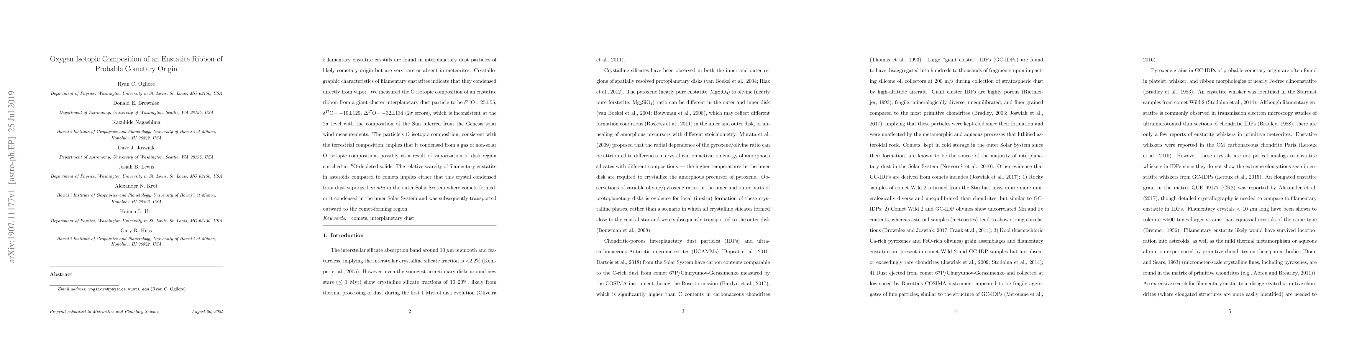 This study measures the oxygen isotopic composition of a rare filamentary enstatite ribbon from a cometary interplanetary dust particle, finding it inconsistent with solar values but consistent with terrestrial composition, suggesting it condensed from a non-solar gas, possibly from an outer Solar System region enriched in $^{16}$O-depleted solids. The rarity of such crystals in asteroids compared to comets indicates their formation either in the outer Solar System or transport from the inner Solar System.