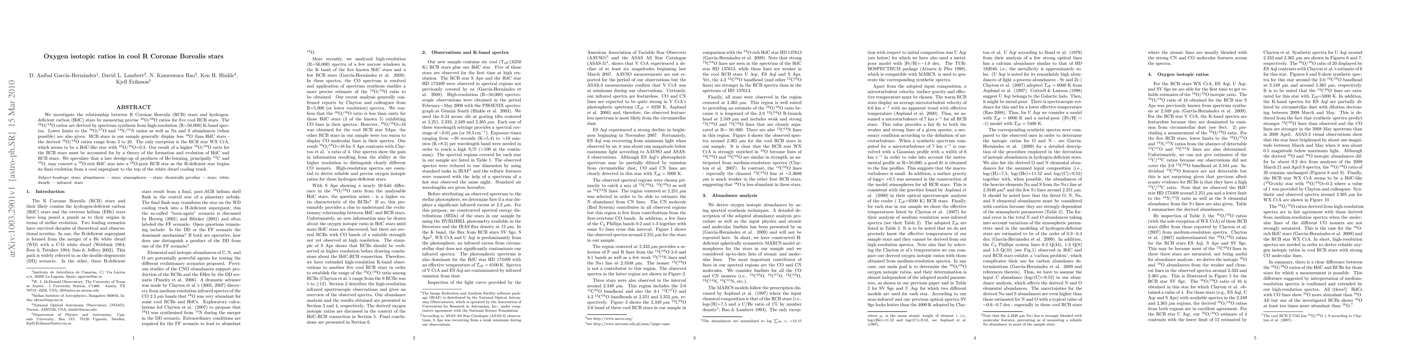 We investigate the relationship between R Coronae Borealis (RCB) stars and hydrogen-deficient carbon (HdC) stars by measuring precise 16O/18O ratios for five cool RCB stars. The 16O/18O ratios are derived by spectrum synthesis from high-resolution (R=50,000) K-band spectra. Lower limits to the 16O/17O and 14N/15}N ratios as well as Na and S abundances (when possible) are also given. RCB stars in our sample generally display less 18O than HdC stars - the derived 16O/18O ratios range from 3 to 20. The only exception is the RCB star WX CrA, which seems to be a HdC-like star with 16O/18O=0.3. Our result of a higher 16O/18O ratio for the RCB stars must be accounted for by a theory of the formation and evolution of HdC and RCB stars. We speculate that a late dredge-up of products of He-burning, principally 12C and 16O, may convert a 18O-rich HdC star into a 18O-poor RCB star as the H-deficient star begins its final evolution from a cool supergiant to the top of the white dwarf cooling track.