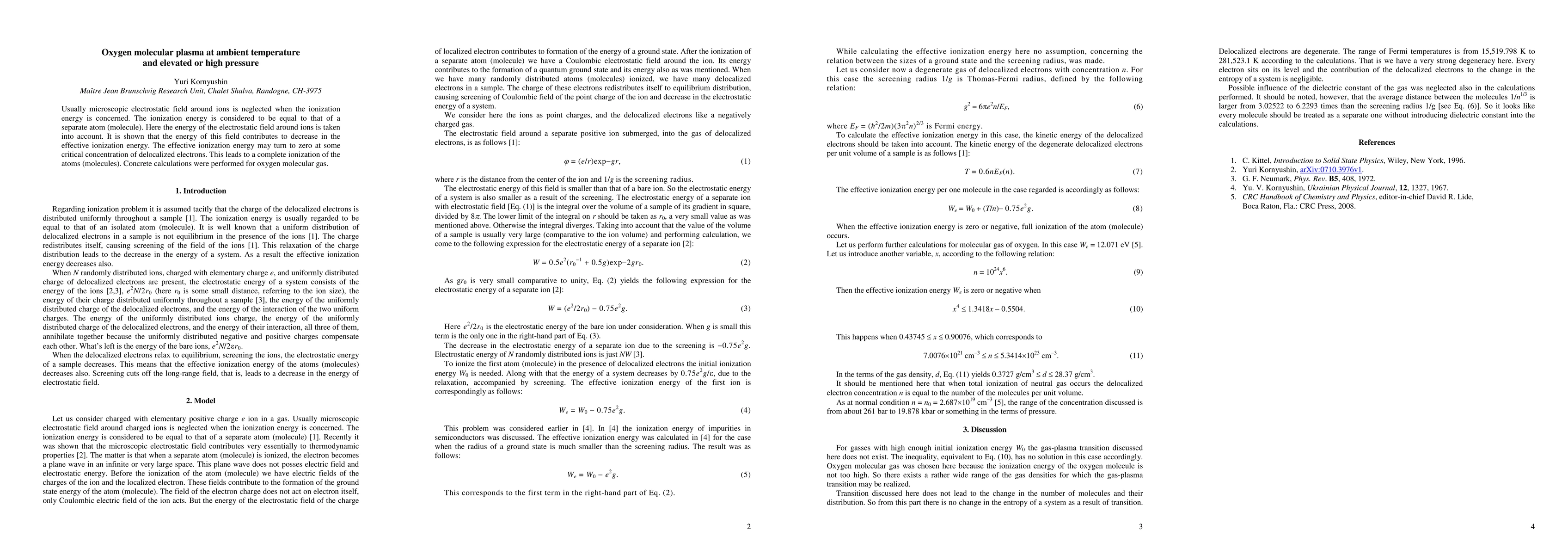 Usually microscopic electrostatic field around ions is neglected when the ionization energy is concerned. The ionization energy is considered to be equal to that of a separate atom (molecule). Here the energy of the electrostatic field around ions is taken into account. It is shown that the energy of this field contributes to decrease in the effective ionization energy. The effective ionization energy may turn to zero at some critical concentration of delocalized electrons. This leads to a complete ionization of the atoms (molecules). Concrete calculations were performed for oxygen molecular gas.