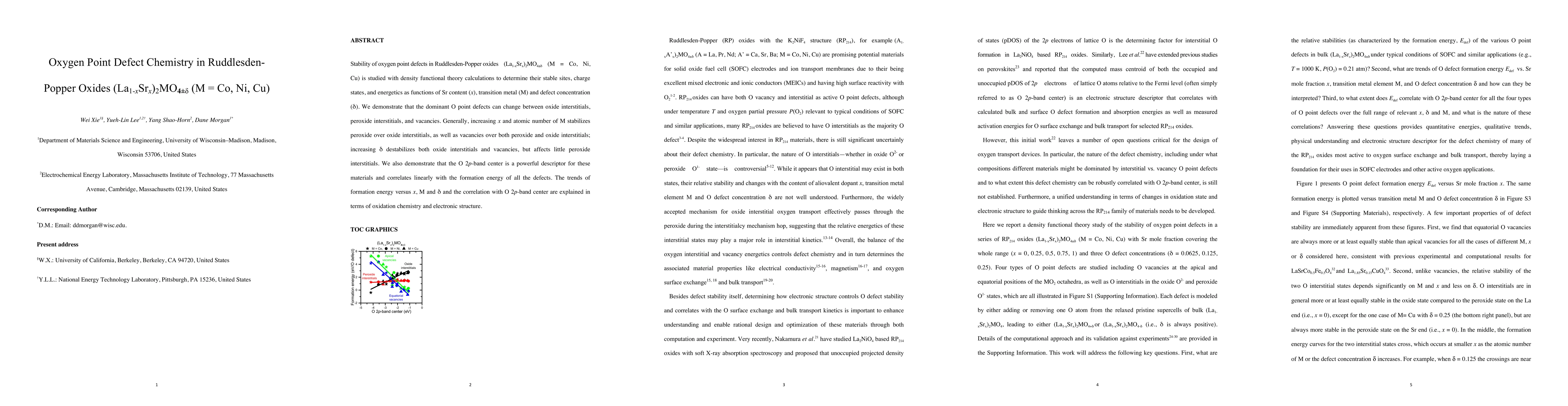 This paper uses density functional theory to investigate the stability of oxygen point defects in Ruddlesden-Popper oxides, finding that defect types and stabilities vary with Sr content, transition metal, and defect concentration. The O 2$p$-band center is identified as a key descriptor correlating linearly with defect formation energies.