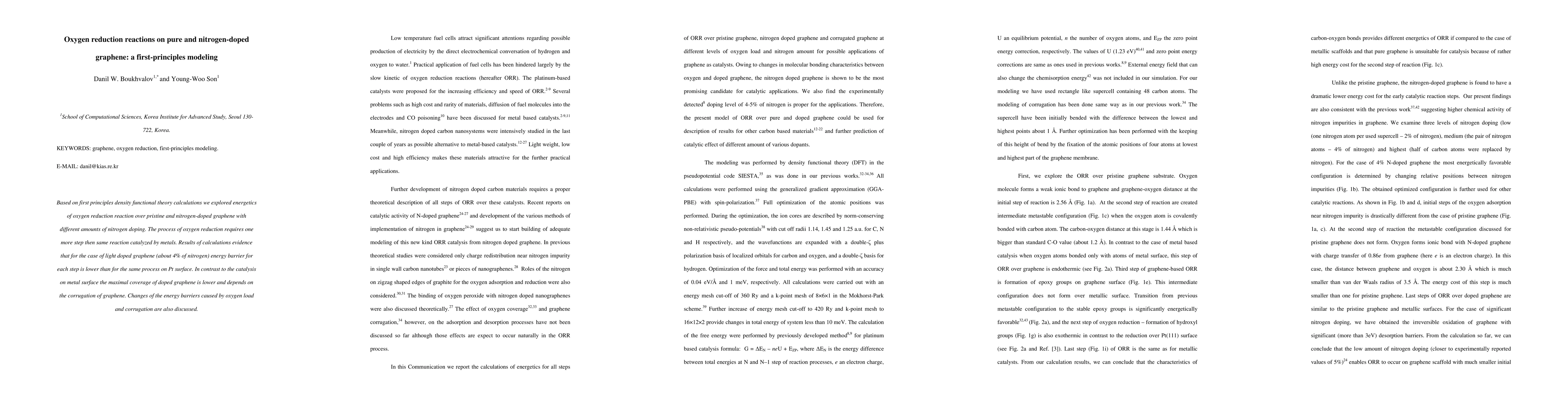 This study uses first-principles density functional theory to model the oxygen reduction reaction on pristine and nitrogen-doped graphene, finding that lightly doped graphene (4% nitrogen) has lower energy barriers for each step compared to platinum. The maximal coverage of doped graphene is lower and depends on graphene's corrugation.