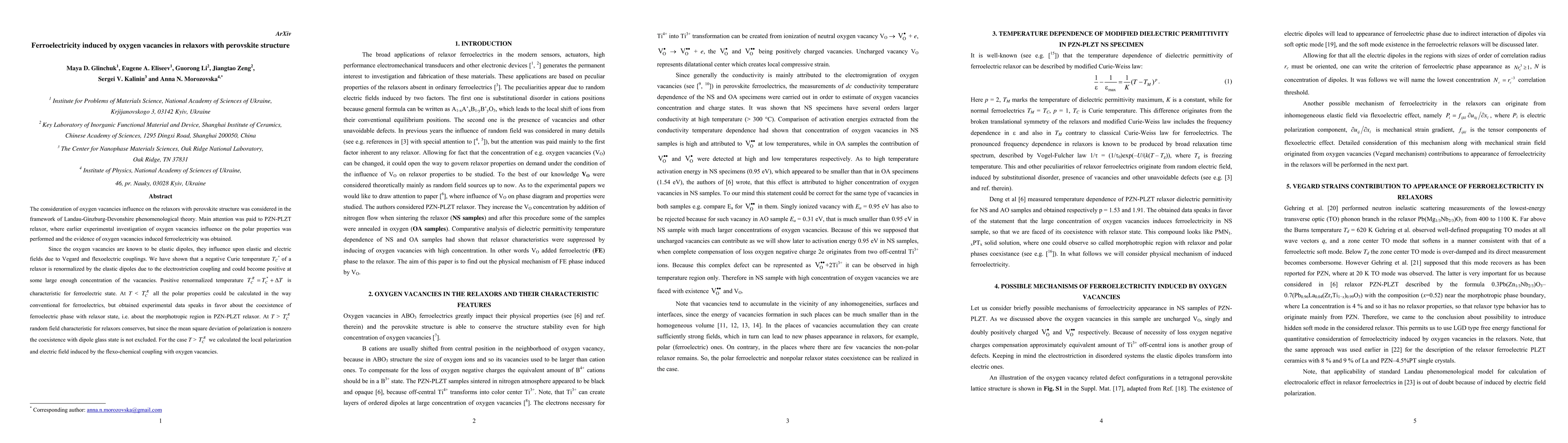 The consideration of oxygen vacancies influence on the relaxors with perovskite structure was considered in the framework of Landau-Ginzburg-Devonshire phenomenological theory. The theory applicability for relaxors is based on the existence of some hidden soft phonon polar mode in them, and its frequency could be zero at some negative temperature TC*. Main attention was paid to PZN-PLZT relaxor described by formula 0.3Pb(Zn1/3Nb2/3)O3-0.7(Pb0.96La0.04(ZrxTi1-x)0.99O3) with x = 0.52, where earlier experimental investigation of oxygen vacancies influence on the polar properties was performed and the evidence of oxygen vacancies induced ferroelectricity was obtained. Since the oxygen vacancies are known to be elastic dipoles, they influence upon elastic and electric fields due to Vegard and flexoelectric coupling. We include the vacancies elastic and electrostrictive contribution into free energy functional. The calculations of the vacancies impact on polar properties were performed using their concentration distribution function. It was shown that the negative Curie temperature of a relaxor TC* is renormalized by the elastic dipoles due to the electrostrictive coupling and can become positive at some large enough concentration of the vacancies. We calculated the local polarization and electric field induced by the flexo-chemical coupling in dependence on the concentration of oxygen vacancies. The coexistence of FE phase and relaxor state can take place because of inhomogeneity of vacancies concentration distribution.