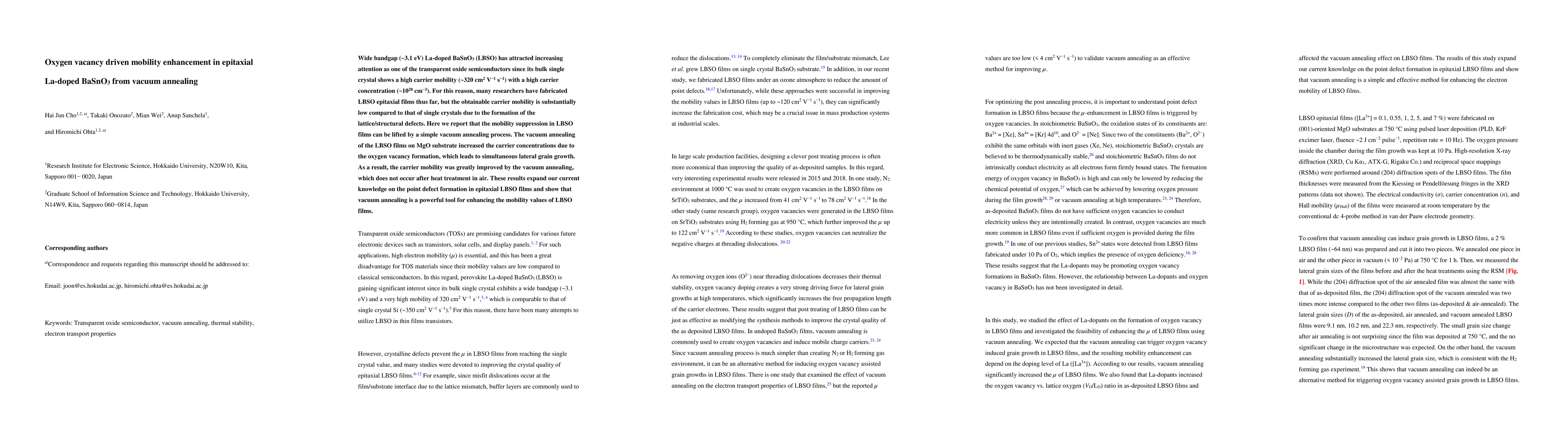 Wide bandgap (~3.1 eV) La-doped BaSnO3 (LBSO) has attracted increasing attention as one of the transparent oxide semiconductors since its bulk single crystal shows a high carrier mobility (~320 cm2 V-1 s-1) with a high carrier concentration (~10^20 cm-3). For this reason, many researchers have fabricated LBSO epitaxial films thus far, but the obtainable carrier mobility is substantially low compared to that of single crystals due to the formation of the lattice/structural defects. Here we report that the mobility suppression in LBSO films can be lifted by a simple vacuum annealing process. The vacuum annealing of the LBSO films on MgO substrate increased the carrier concentrations due to the oxygen vacancy formation, which leads to simultaneous lateral grain growth. As a result, the carrier mobility was greatly improved by the vacuum annealing, which does not occur after heat treatment in air. These results expand our current knowledge on the point defect formation in epitaxial LBSO films and show that vacuum annealing is a powerful tool for enhancing the mobility values of LBSO films.