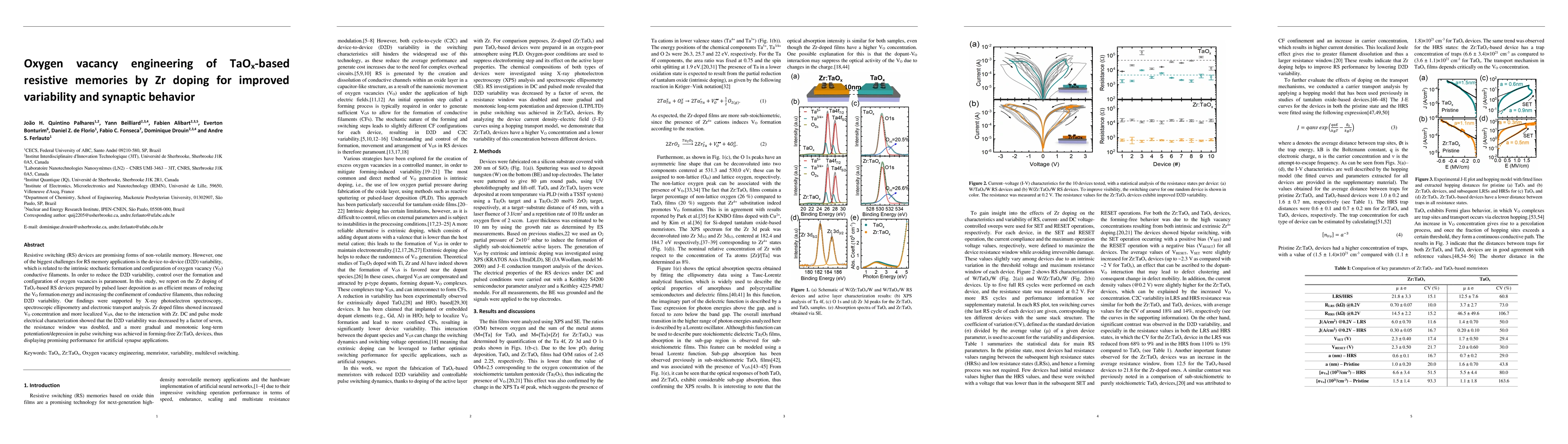 This study investigates Zr doping in TaOx-based resistive switching devices to reduce device-to-device variability by controlling oxygen vacancy formation and enhancing filament confinement. The results show a significant reduction in variability, improved resistance window, and more gradual synaptic behavior, making the Zr:TaOx devices promising for artificial synapse applications.