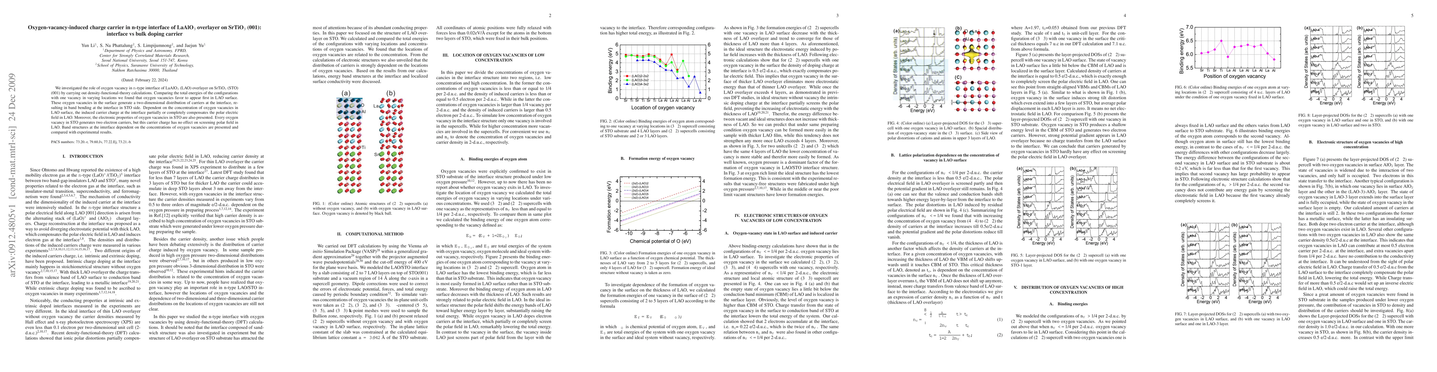 This research uses density-functional-theory calculations to investigate how oxygen vacancies create n-type charge carriers at the interface between LaAlO3 and SrTiO3, showing that they primarily occur at the LAO surface and generate carriers that partially screen the polar electric field in LAO, while vacancies in SrTiO3 produce electron carriers without affecting LAO’s polar field.