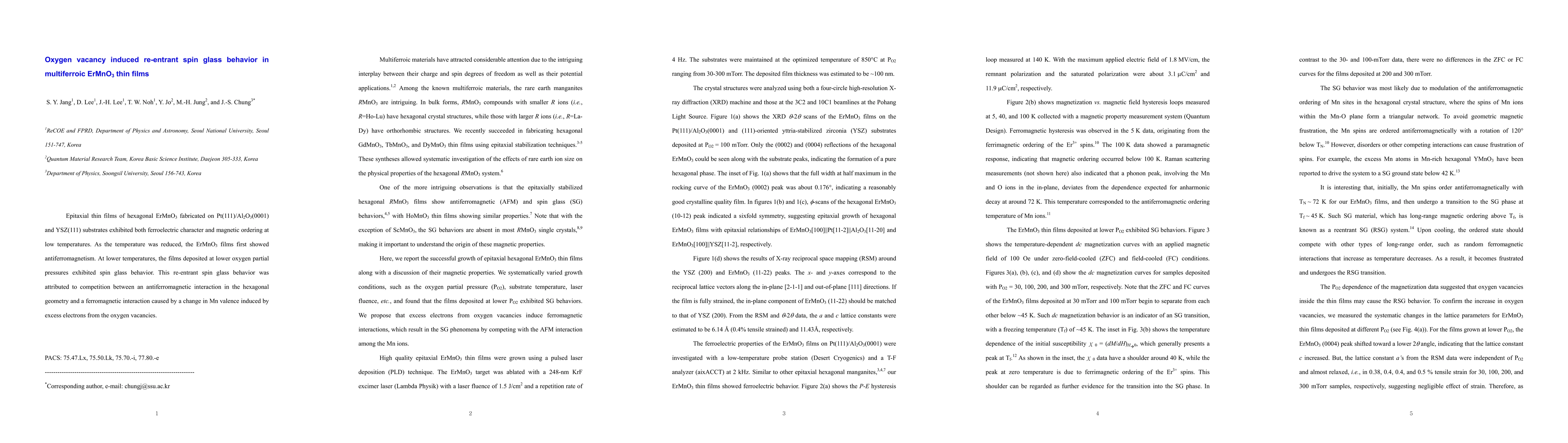 Epitaxial thin films of hexagonal ErMnO3 fabricated on Pt(111)/Al2O3(0001) and YSZ(111) substrates exhibited both ferroelectric character and magnetic ordering at low temperatures. As the temperature was reduced, the ErMnO3 films first showed antiferromagnetism. At lower temperatures, the films deposited at lower oxygen partial pressures exhibited spin glass behavior. This re-entrant spin glass behavior was attributed to competition between an antiferromagnetic interaction in the hexagonal geometry and a ferromagnetic interaction caused by a change in Mn valence induced by excess electrons from the oxygen vacancies.
