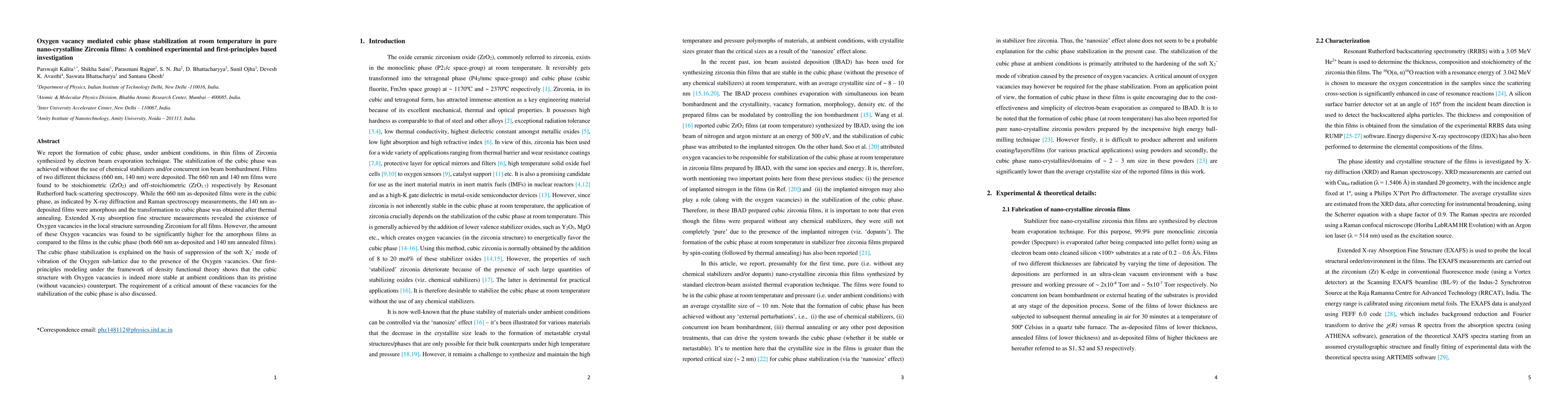 The paper reports the stabilization of cubic phase zirconia at room temperature in thin films synthesized via electron beam evaporation, achieved through oxygen vacancies rather than chemical stabilizers. The films, with varying thicknesses and oxygen content, were analyzed using various spectroscopic techniques, revealing that a critical amount of oxygen vacancies is required to suppress the soft X2-mode vibration, thus stabilizing the cubic phase.