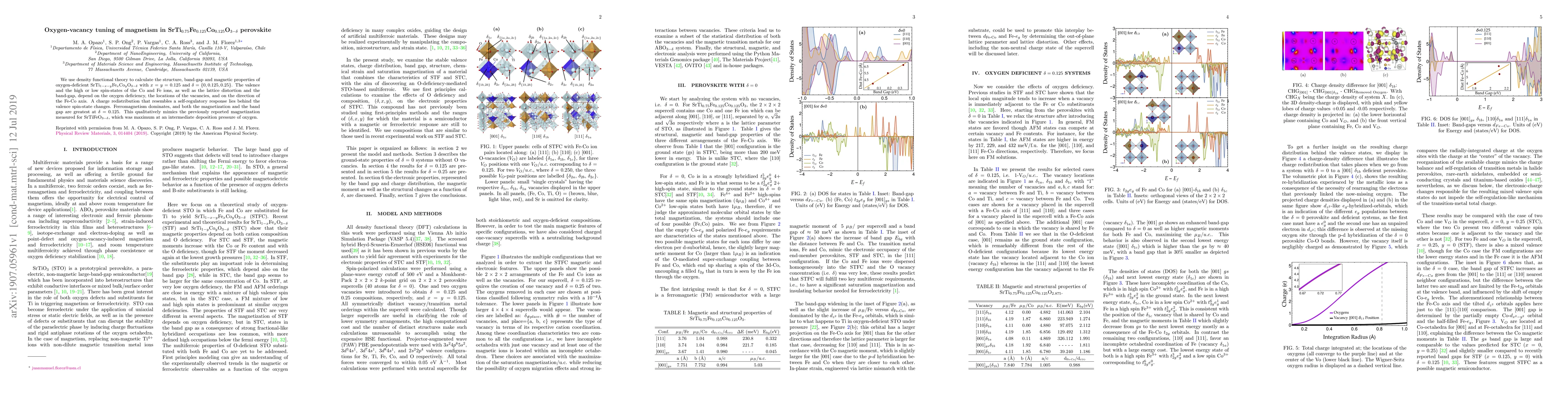 We use density functional theory to calculate the structure, band-gap and magnetic properties of oxygen-deficient SrTi$_{1-x-y}$Fe$_x$Co$_y$O$_{3-\delta}$ with x = y = 0.125 and ${\delta}$ = (0,0.125,0.25). The valence and the high or low spin-states of the Co and Fe ions, as well as the lattice distortion and the band-gap, depend on the oxygen deficiency, the locations of the vacancies, and on the direction of the Fe-Co axis. A charge redistribution that resembles a self-regulatory response lies behind the valence spin-state changes. Ferromagnetism dominates, and both the magnetization and the band gap are greatest at ${\delta}$ = 0.125. This qualitatively mimics the previously reported magnetization measured for SrTiFeO$_{3-\delta}$, which was maximum at an intermediate deposition pressure of oxygen.
